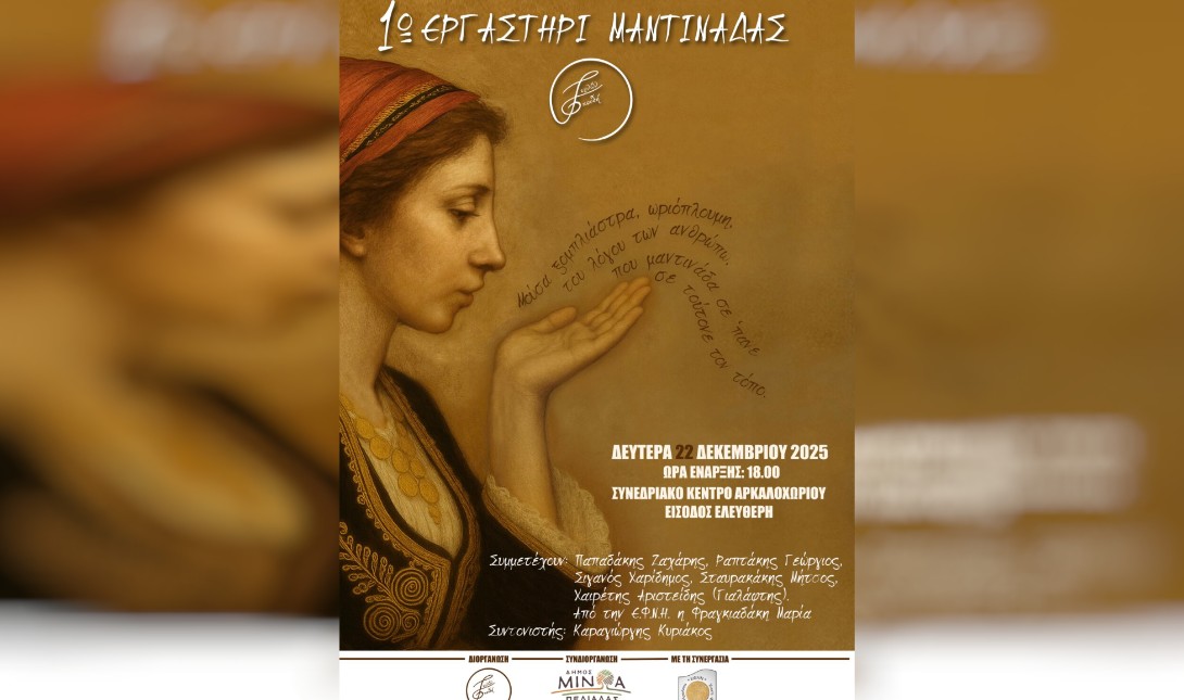 Το 1ο Εργαστήρι Μαντινάδας θα πραγματοποιηθεί τη Δευτέρα 22 Δεκεμβρίου 2025, στις 18:00, στο Συνεδριακό Κέντρο Αρκαλοχωρίου.