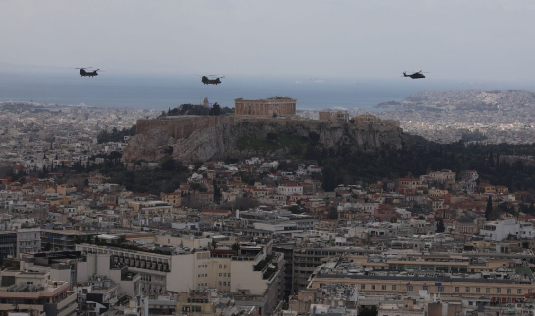 Από νωρίς το πρωί, τα βλέμματα στράφηκαν στον ουρανό, καθώς σχηματισμοί μαχητικών της Πολεμικής Αεροπορίας πραγματοποίησαν διελεύσεις πάνω από τον Λυκαβηττό και το Σύνταγμα, στο πλαίσιο της στρατιωτικής παρέλασης για την εθνική επέτειο.