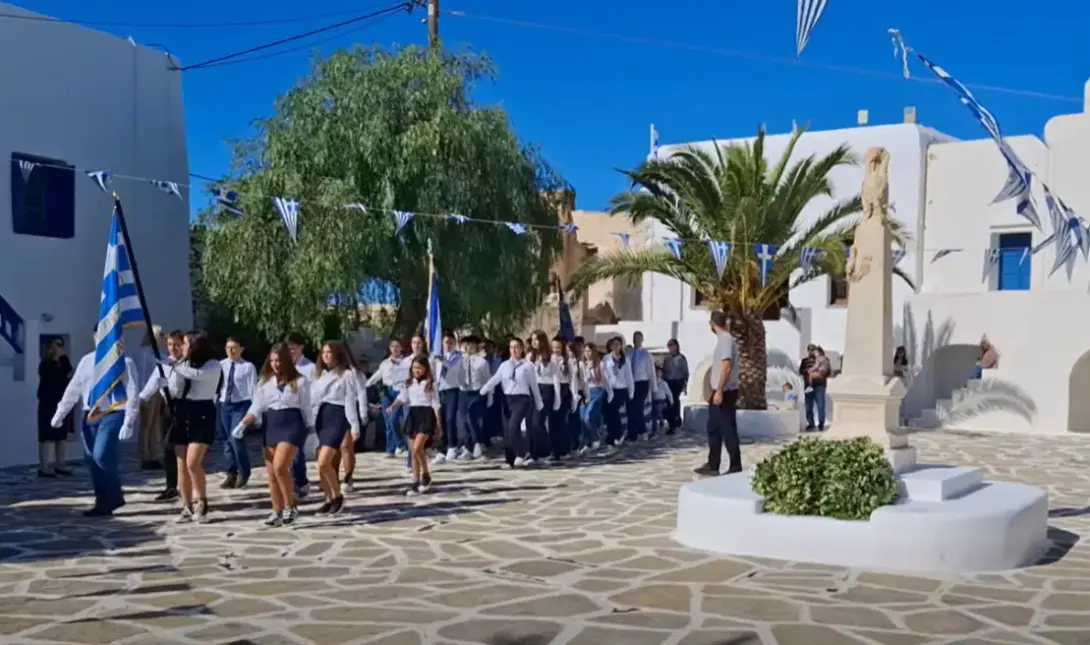Στη Σίκινο οι μαθητές νηπιαγωγείου – δημοτικού – γυμνασίου και λυκείου ανέρχονται σε 14, αλλά στη φετινή παρέλαση για την εθνική επέτειο της 28ης Οκτωβρίου είχαν καλή παρέα: Συμμαθητές τους από το δεύτερο Γυμνάσιο Ελληνικού.