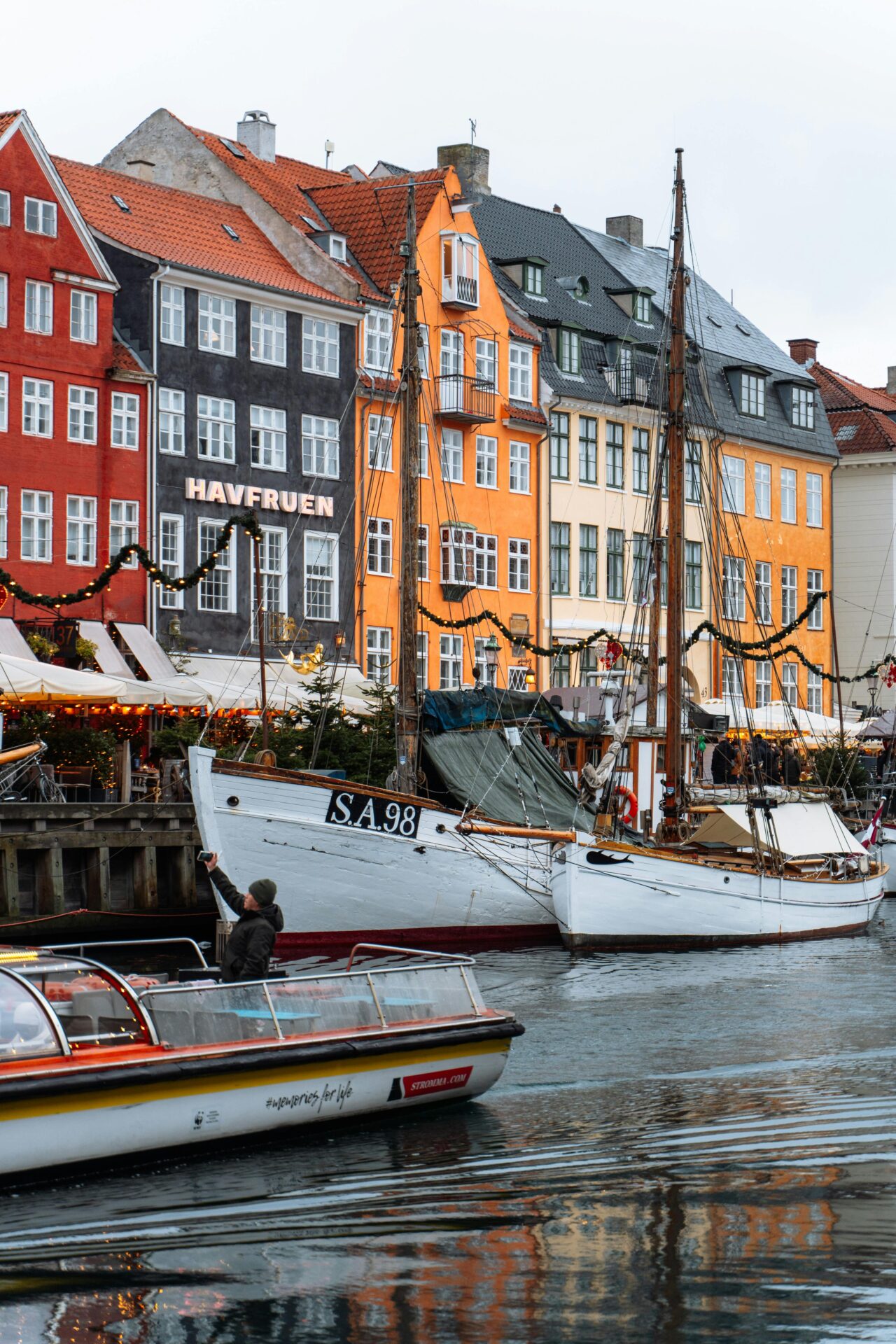 Το γραφικό λιμάνι Nyhavn της Κοπεγχάγης, με τα εμβληματικά πολύχρωμα σπίτια του, γίνεται ακόμη πιο γοητευτικό καθώς φιλοξενεί τη χριστουγεννιάτικη αγορά. Οι επισκέπτες μπορούν να πιουν ζεστό κρασί, απολαμβάνοντας τη θέα στην προκυμαία.
