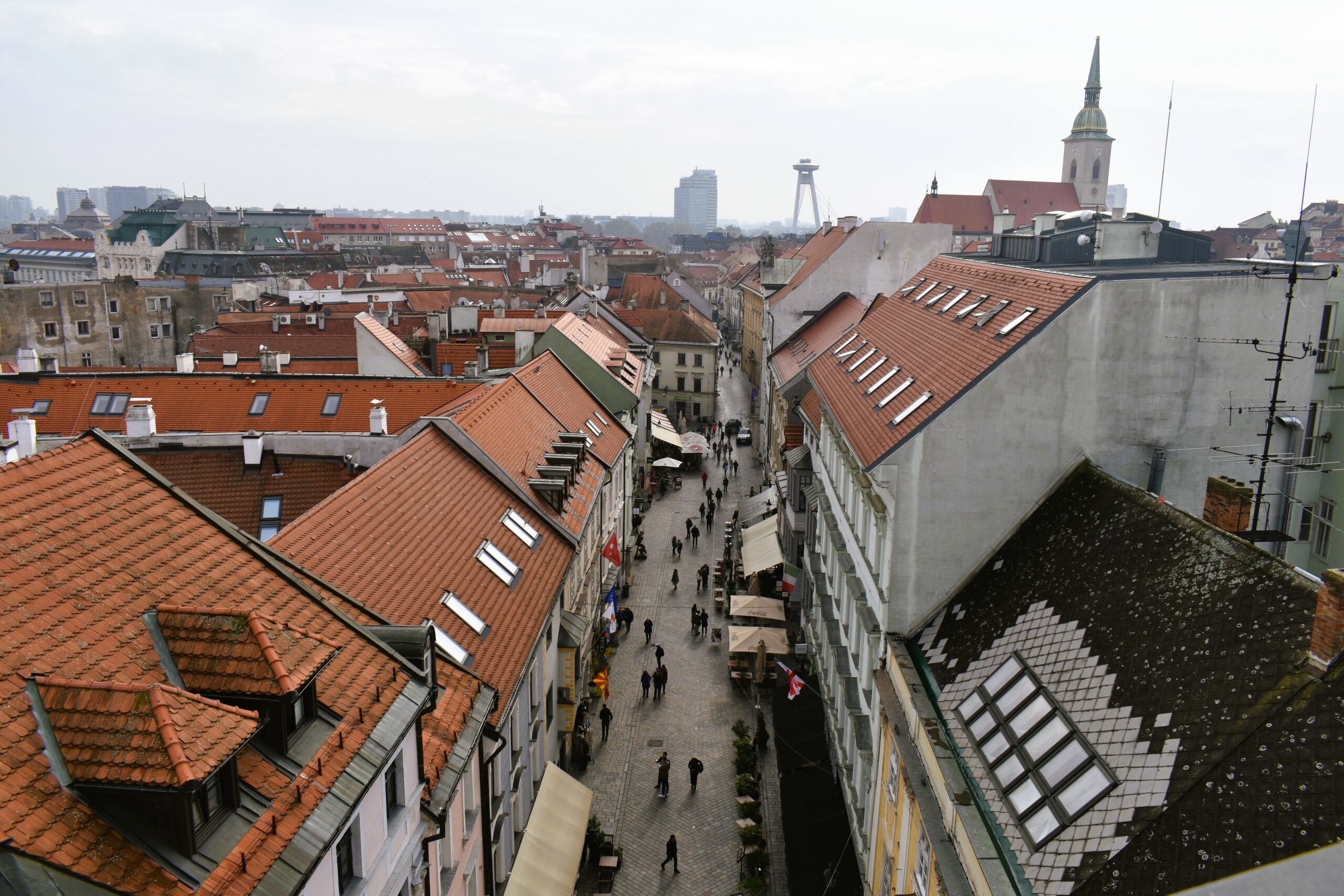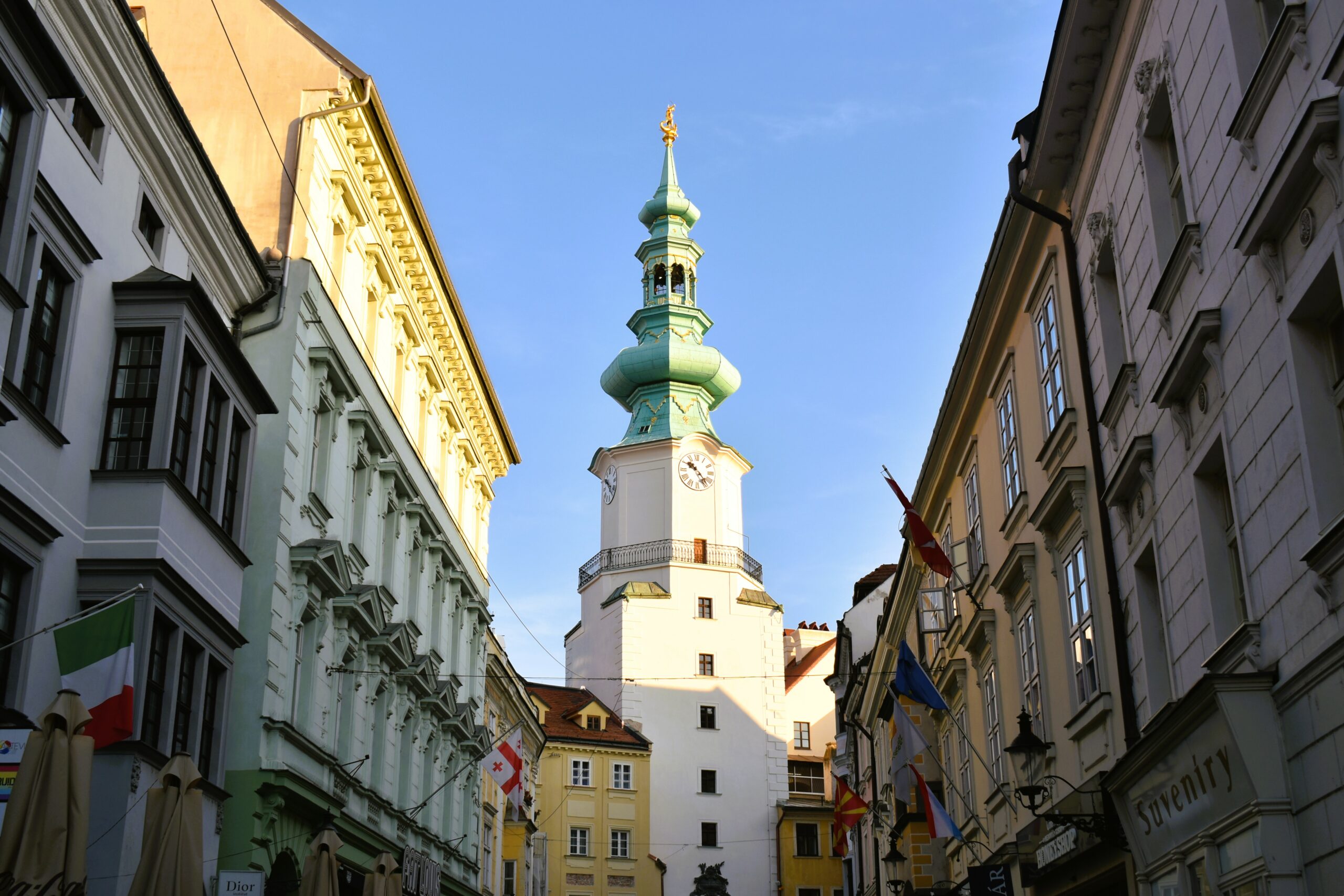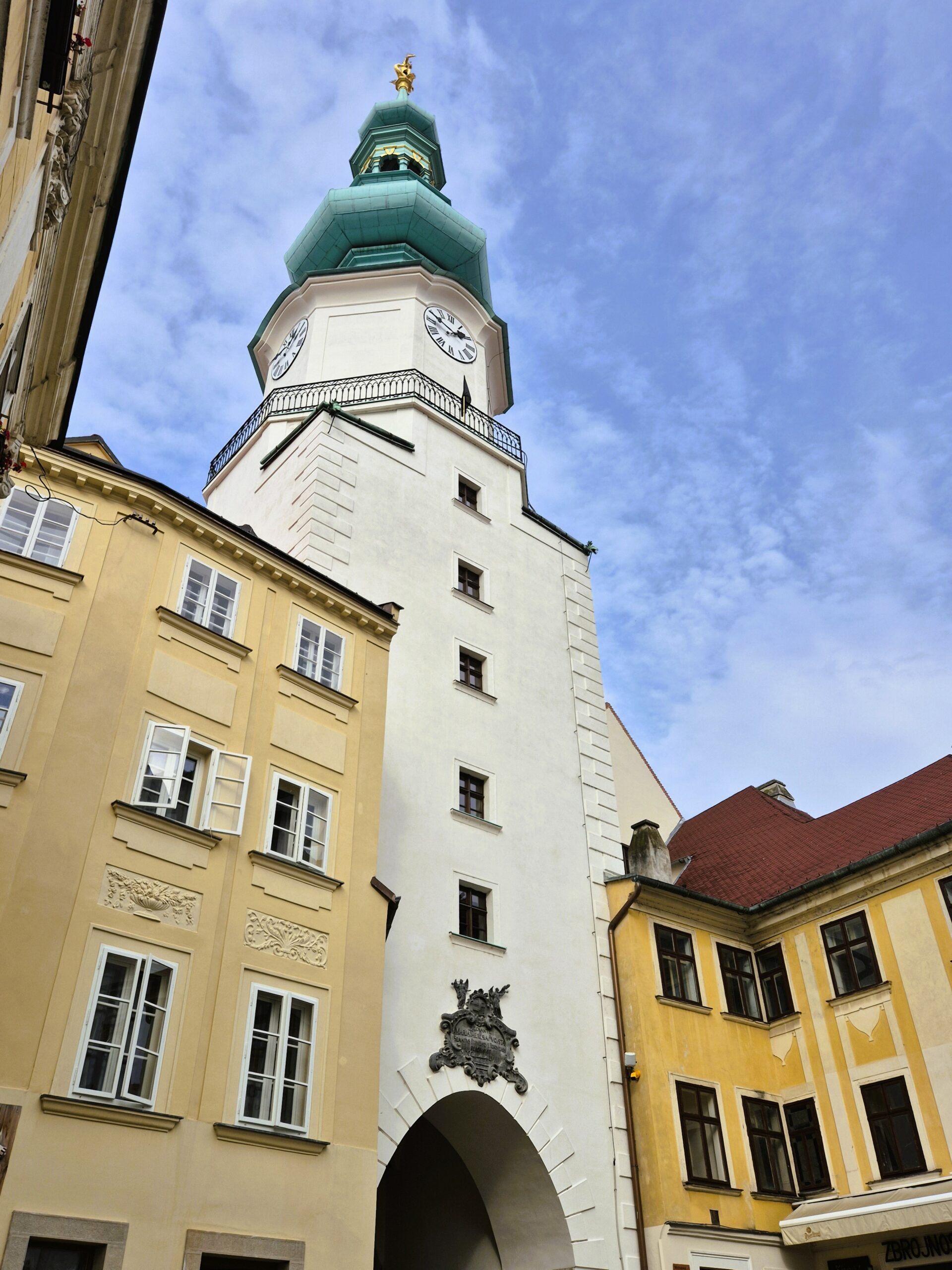 Μην αρκεστείτε στο να τη θαυμάσετε από χαμηλά, η εμπειρία της ανάβασης στην κορυφή του πύργου, που φέρει το ρολόι που κάποτε σήμαινε τη λήξη των εμπορικών συναλλαγών της ημέρας και στέφεται από το χρυσοποίκιλτο άγαλμα του αρχαγγέλου Μιχαήλ -του οποίου την πολυτάραχη ιστορία θα πληροφορηθείτε ανεβαίνοντας στον πύργο-, προσφέρει υπέροχη πανοραμική θέα. Από το σημείο αυτό το βλέμμα σας θα περιπλανηθεί πάνω από τις στέγες της πόλης από μια διαφορετική οπτική, στον πολυσύχναστο πεζόδρομο Michalská, φθάνοντας βέβαια στο Κάστρο της πόλης. Αφού απολαύσετε τη μαγευτική θέα της στολισμένης Μπρατισλάβα, ένα από τα στενότερα σπίτια της Ευρώπης, πλάτους μόλις 130 εκ., στο νο15 του δρόμου πίσω και αριστερά της πύλης.