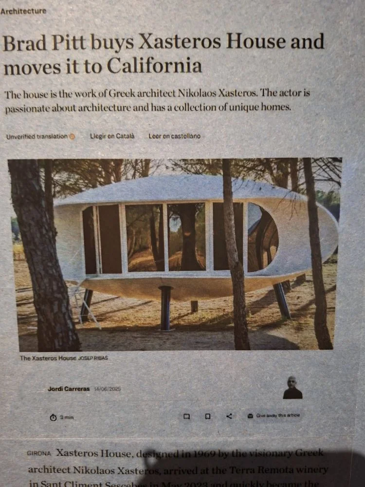 Ένα από τα σπίτια-ούφο του Νικόλαου Ξάστερου έχει αποκτήσει ο Μπραντ Πιτ και το έχει τοποθετήσει στην έπαυλή του στην Καλιφόρνια