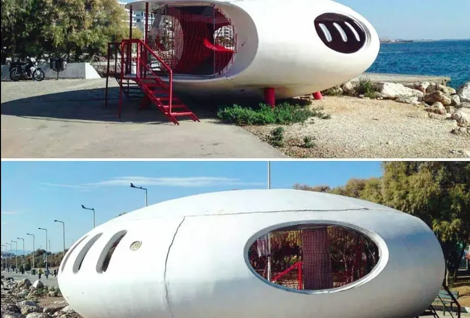 Το 2009 η καλλιτεχνική ομάδα Errands βρήκε ένα σπίτι-ούφο εγκαταλελειμμένο σε παραλιακή περιοχή του Λουτρακίου. Το αγόρασαν για 1 ευρώ και το μετέφεραν κομμάτι-κομμάτι στην παραλία του Φλοίσβου.