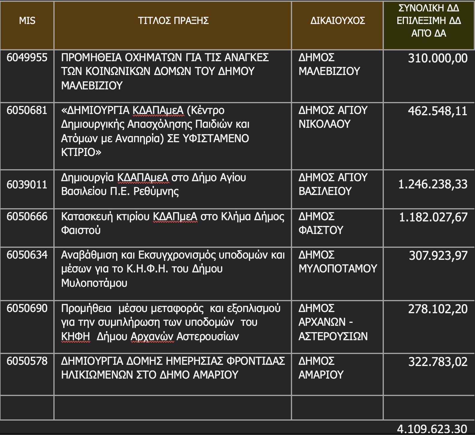 4. Κατασκευή κτιρίου ΚΔΑΠμεΑ στο Κλήμα Δήμος Φαιστού – Δικαιούχος: Δήμος Φαιστού, Επιλέξιμη Δημόσια Δαπάνη: 1.182.027,67 ευρώ.