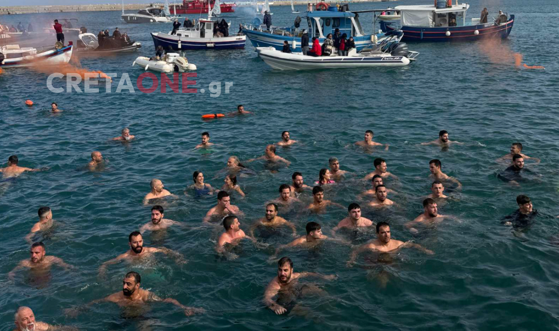 Ο Αρχιεπίσκοπος Κρήτης κ.κ. Ευγένιος μετά την τελετή πέταξε τον Τίμιο Σταυρό, με τους κολυμβητές να βουτούν στα νερά του λιμένα Ηρακλείου για να τον πιάσουν, να τον προσκυνήσουν και να λάβουν την ευλογία του.