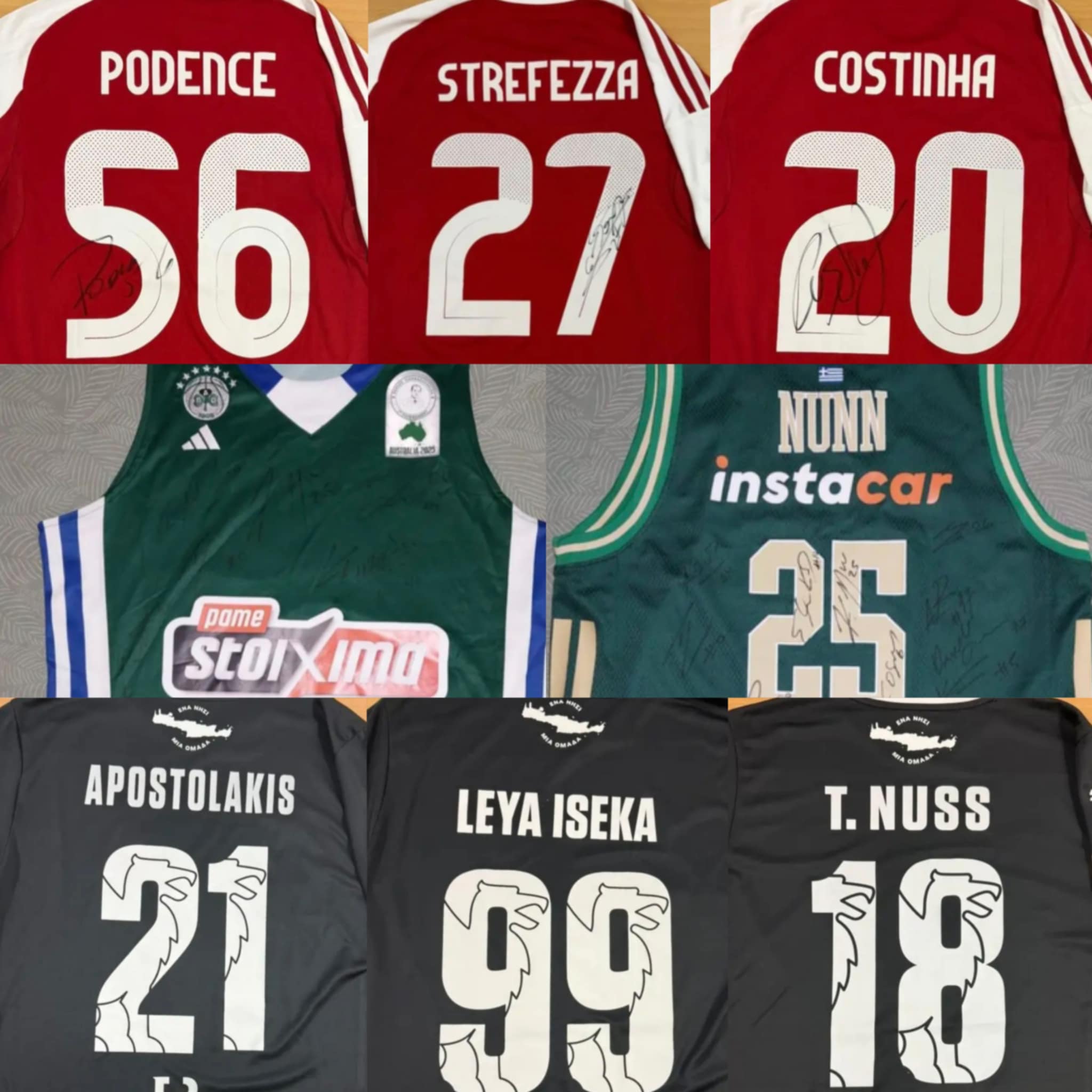 - Η δημοπρασία περιλαμβάνει φανέλες ποδοσφαιριστών του ΟΦΗ και Ολυμπιακού, καθώς και συλλεκτική μπλούζα του Παναθηναϊκού.