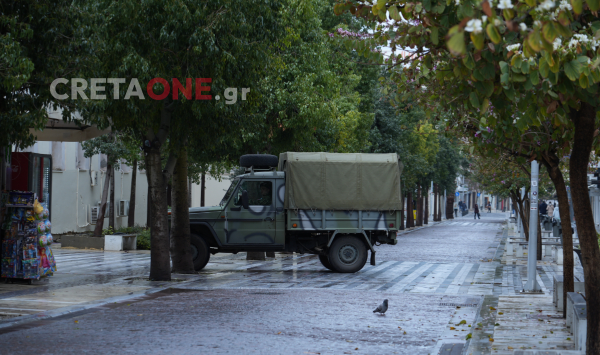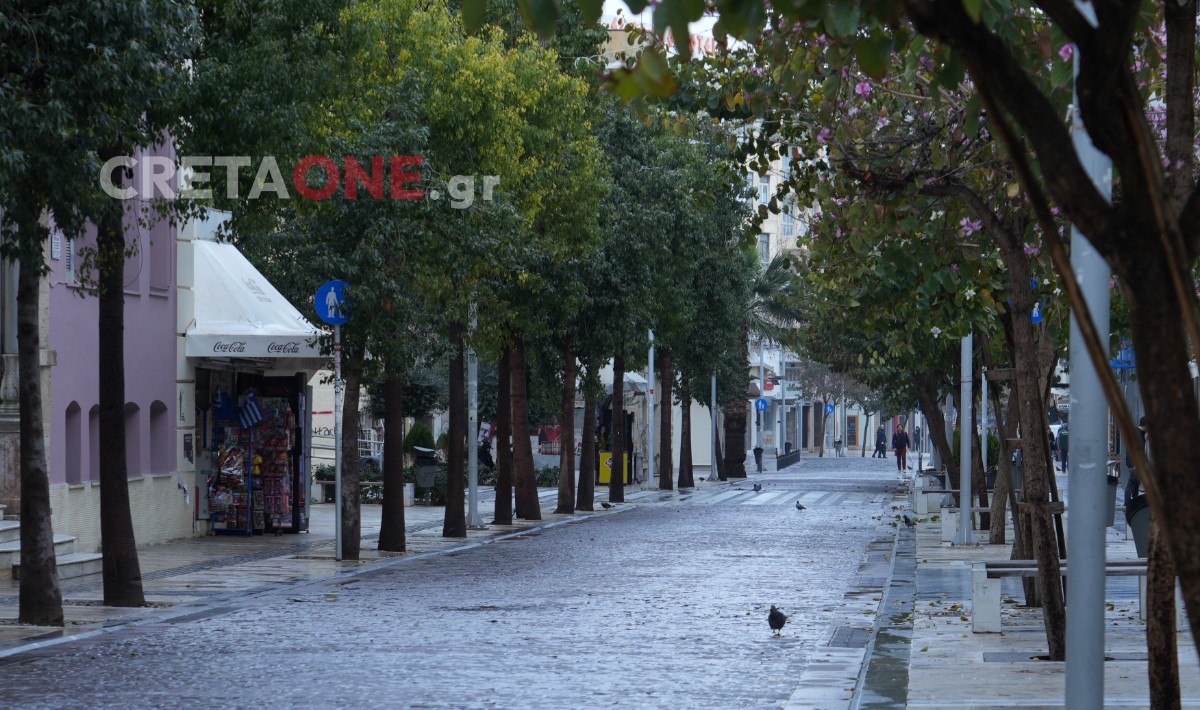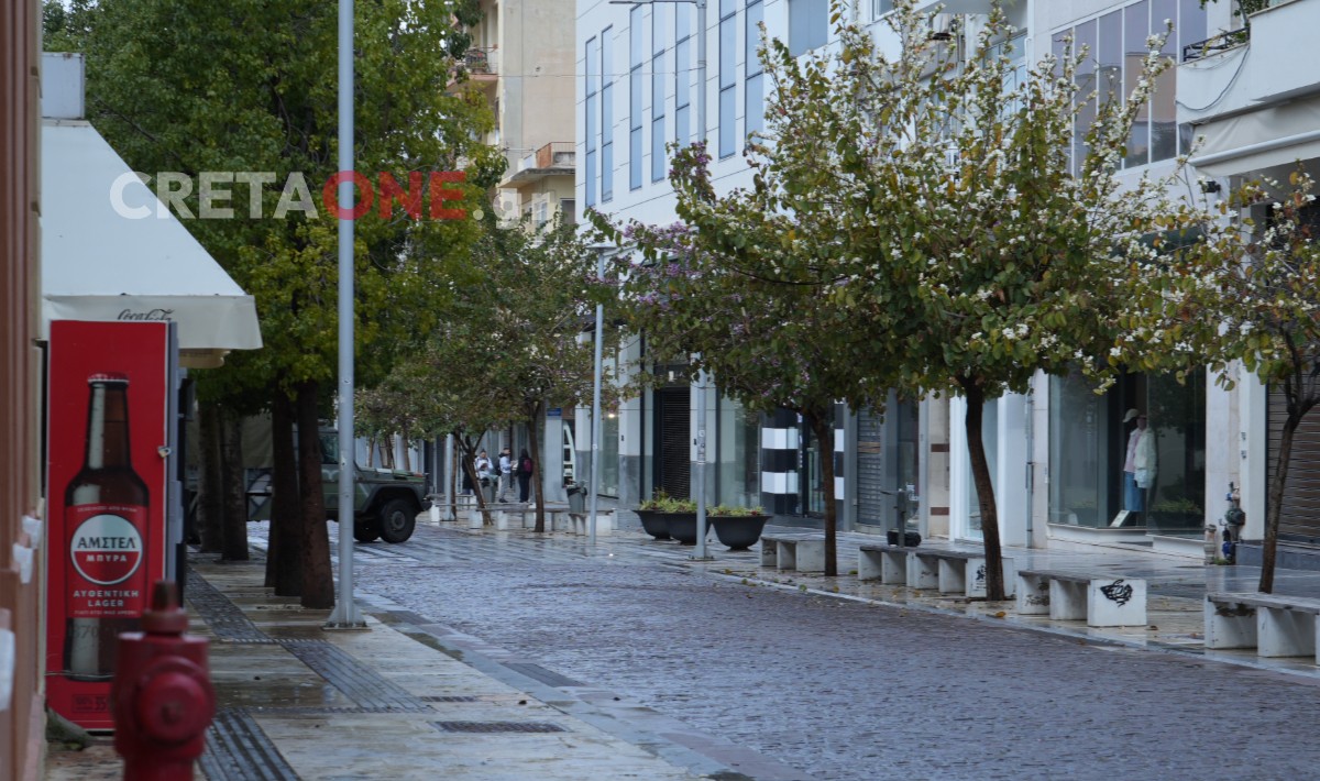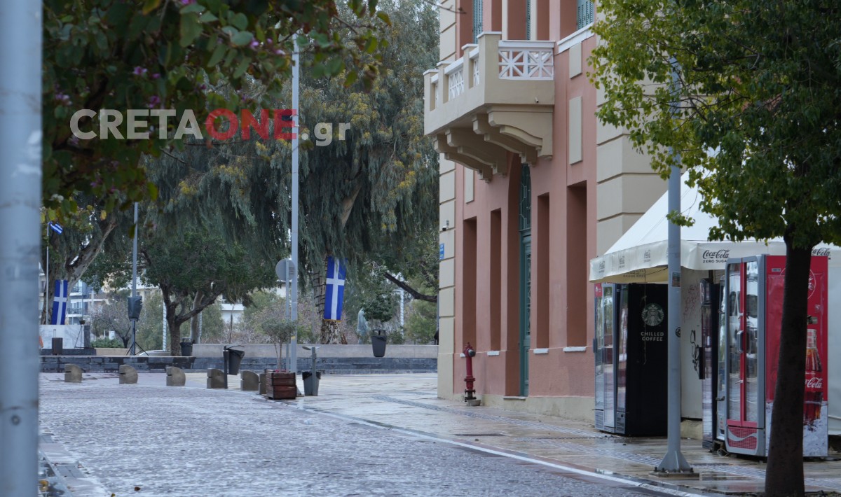 Η συνεχής βροχόπτωση και οι δυσμενείς καιρικές συνθήκες άδειασαν τους δρόμους της πόλης του Ηρακλείου, δημιουργώντας μια εικόνα ασυνήθιστης ηρεμίας για μια ημέρα που παραδοσιακά χαρακτηρίζεται από παρελάσεις, μουσικές και πλήθος κόσμου.