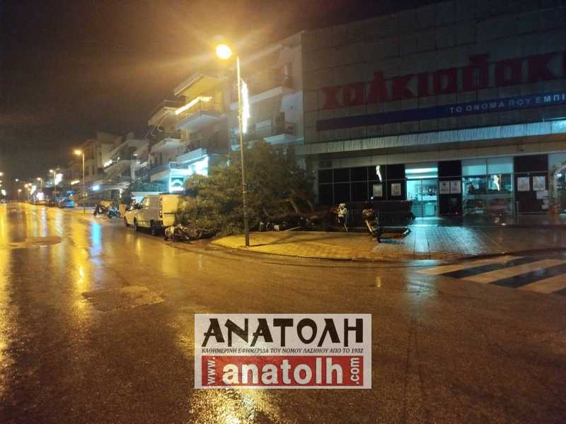 Η κακοκαιρία που έπληξε την περιοχή τα ξημερώματα της Παρασκευής, προκάλεσε την πτώση μεγάλου δέντρου έξω από το σούπερ μάρκετ Χαλκιαδάκης στην οδό Επιμενίδου.