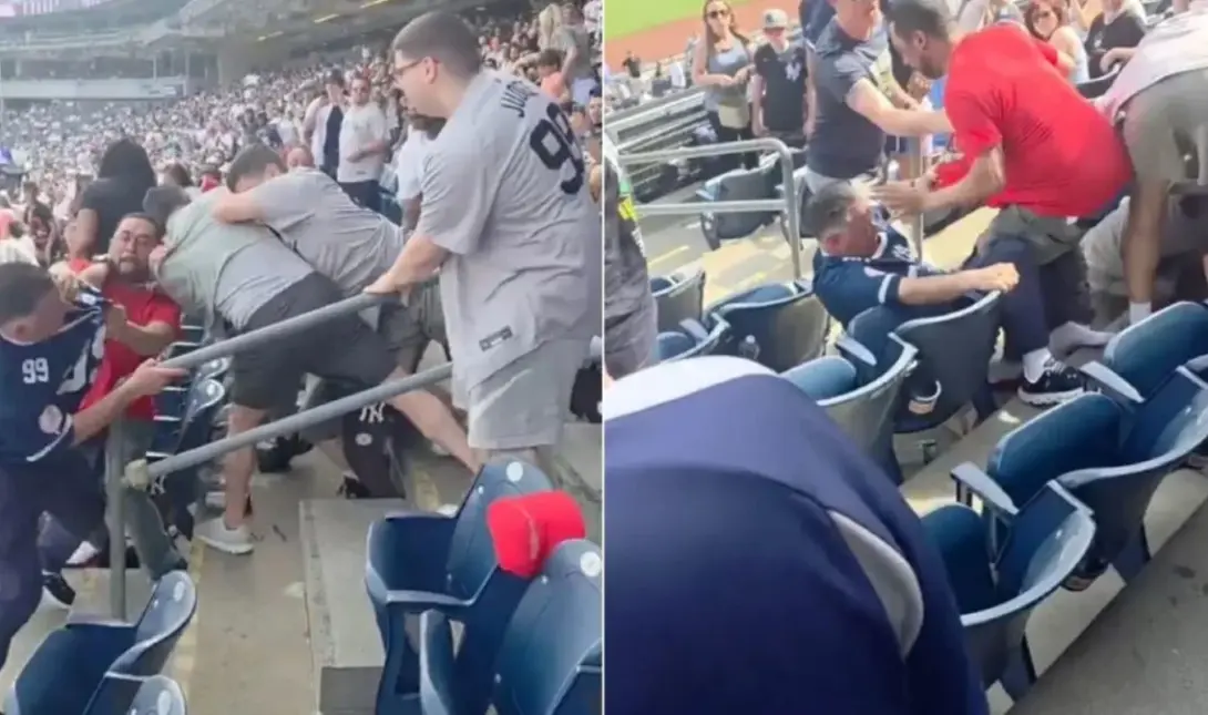 Η κατάσταση ξεφεύγει όταν ένας φίλος των Yankees με γκρι μπλούζα εμφανίζεται ξαφνικά στο πλάνο και επιτίθεται με γροθιά, ρίχνοντάς τους προς τα καθίσματα, την ώρα που το πλήθος αντιδρά φωνάζοντας.