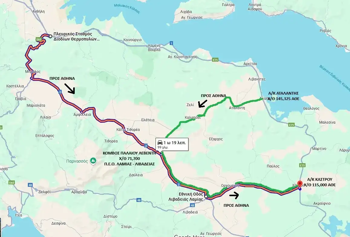 Όλα τα οχήματα θα εκτρέπονται στο ύψος του Α/Κ Νίκαιας (Χ/Θ 348+106) και μέσω του κλάδου εξόδου προς Λάρισα θα εισέρχονται στην Π.Ε.Ο. Αθηνών – Θεσσαλονίκης και στην Λεωφόρο Καραμανλή και θα εισέρχονται στον Π.Α.Θ.Ε.: