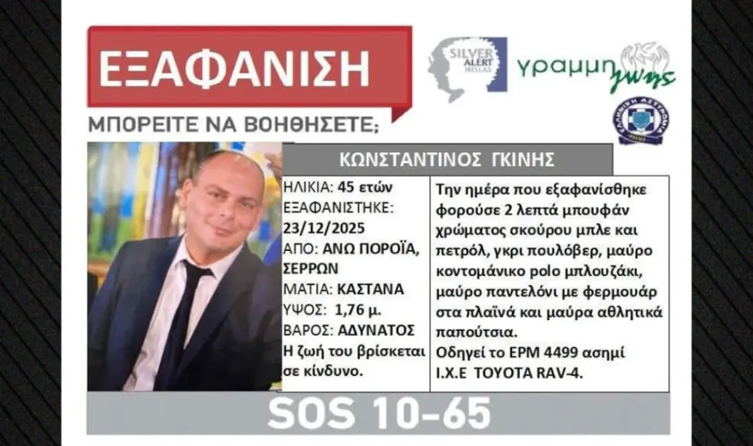 Έφυγε από την οικία του προς άγνωστη κατεύθυνση και για άγνωστη αιτία με το υπ’ αριθμόν ΕΡΜ 4499 Ι.Χ.Ε όχημά του, μάρκας TOYOTA RAV-4, χρώματος ασημί.