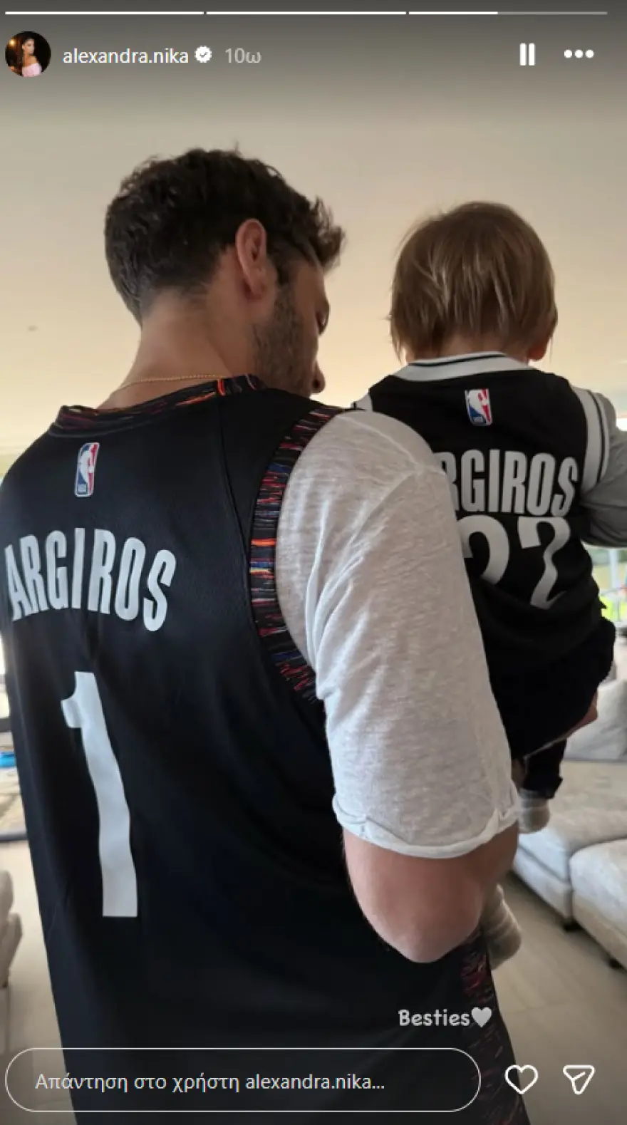 Η σύζυγος του τραγουδιστή κοινοποίησε στον προσωπικό της λογαριασμό στο Instagram ένα στιγμιότυπο με τον καλλιτέχνη να κρατάει το ενός έτους παιδί του, ενώ φορούσαν φανέλα του NBA που έγραφε «Argiros».