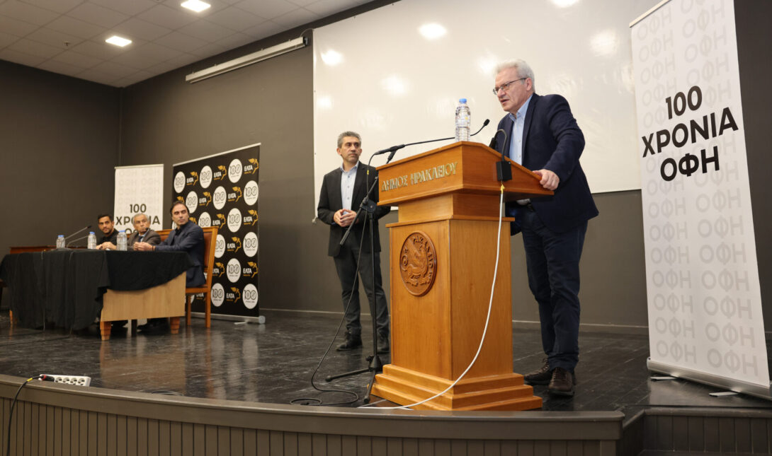 Ο Δήμαρχος Ηρακλείου, μιλώντας στην αίθουσα «M. Kαρέλης», παρουσία του Αντιπροέδρου της ΠΑΕ ΟΦΗ Ηλία Πουρσανίδη, στελεχών της ομάδας, του Πρόεδρου του Δ.Σ. των ΕΛΤΑ Δανιήλ Μπεναρδούτ και του Αντιδημάρχου Άθλησης & Αθλητισμού Γιάννη Τσαπάκη και του Αντιδημάρχου Προγραμματισμού & Ψηφιακού Μετασχηματισμού Τάσου Τσατσάκη, αναφέρθηκε στους άρρηκτους δεσμούς του ΟΦΗ με την πόλη και την κοινωνία της, επισημαίνοντας: «Χρόνια πολλά στον ΟΦΗ μας. Είναι τέτοιες οι ημέρες οι οποίες συνδυάζονται με μια εορταστική διάθεση που ξυπνάει σε ότι αφορά ειδικά τον ΟΦΗ και πολύ εύκολα και αυθόρμητα εκδηλώνεται και έχει ήδη εκδηλωθεί. Θα το δούμε σε όλη τη σημερινή ημέρα που είναι η ημέρα της επίσημης σύνδεσης του Σωματείου με την πόλη, σαν σήμερα, πριν από 100 χρόνια. Αυτό δημιουργεί σε όλους μας μια ιδιαίτερη συγκίνηση. Από την πλευρά της πόλης αυτό που έχει ιδιαίτερη σημασία είναι η κοινωνική ρίζα του ΟΦΗ. Ο ΟΦΗ ιδρύθηκε από ανθρώπους της πόλης εκείνη τη μεταβατική εποχή για την Κρήτη, για το Ηράκλειο και για τη χώρα. Ήταν άνθρωποι που εκπροσωπούσαν την κοινωνία συνολικά. Ανάμεσα τους ήταν άνθρωποι από μια εργατική βάση αλλά και νέοι άνθρωποι. Άλλωστε η διάσταση την οποία πήρε ο ΟΦΗ εξαρχής είχε αυτό το κοινωνικό πρόσημο που το διατήρησε σε όλη την πορεία. Το θεωρώ πάρα πολύ σημαντικό για τη σχέση αυτού του Συλλόγου που είχε τη λέξη φίλαθλος εξαρχής και φυσικά την διατηρεί και σήμερα. Ο ΟΦΗ στις γειτονιές, ως μια ενθάρρυνση, ένα παράδειγμα και μια αφετηρία για την ενασχόληση με τον αθλητισμό. Όπως και η διάσταση του γυναικείου αθλητισμού από πάρα πολύ νωρίς, όταν δεν ήταν καθόλου αυτονόητο. Αυτό έγινε με τον ΟΦΗ, μαζί με όλα τα υπόλοιπα αθλήματα που περιλαμβάνουν το στίβο, το μπάσκετ κ.α. Επίσης υπάρχει και η ποδοσφαιρική διάσταση. Είναι φυσικό να προβάλλεται περισσότερο αυτή η ομάδα που έχει τον χαρακτήρα της ΠΑΕ και οργανώνει σήμερα αυτή την εκδήλωση.