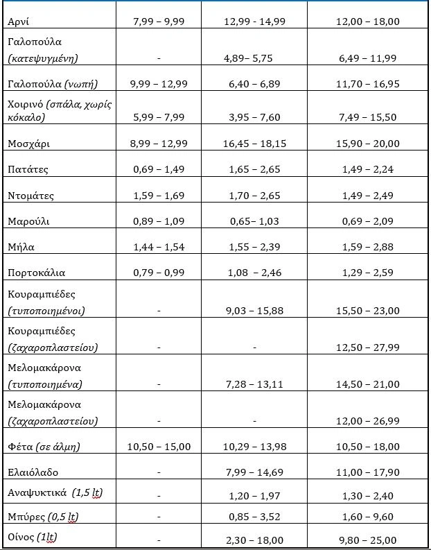 Το εύρος των τιμών δικαιολογείται από την καταγραφή σειράς προϊόντων διαφορετικής ποιότητας, σε αρκετές τοπικές αγορές και διαφορετικούς τύπους καταστημάτων.