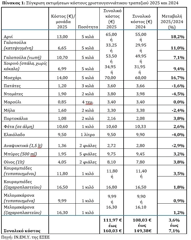 Ακριβότερο έως 7% αναμένεται να είναι φέτος το χριστουγεννιάτικο τραπέζι, σε σύγκριση με το αντίστοιχο τραπέζι του 2024, σύμφωνα με το Ινστιτούτο Εμπορίου και Υπηρεσιών της Ελληνικής Συνομοσπονδίας Εμπορίου και Επιχειρηματικότητας (ΙΝ.ΕΜ.Υ.-ΕΣΕΕ).