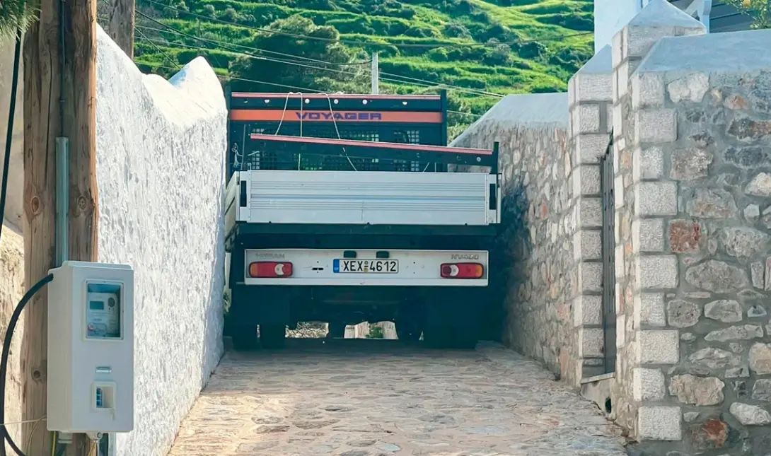 Τα οχήματα που μεταφέρουν γεννήτριες, φωτιστικά σώματα και τεχνικό εξοπλισμό κινούνται με εξαιρετικά αργούς ρυθμούς, περνώντας κυριολεκτικά «στον πόντο» ανάμεσα σε ψηλούς πέτρινους τοίχους και παραδοσιακές αυλόπορτες.