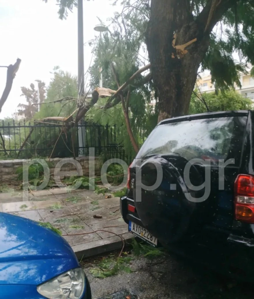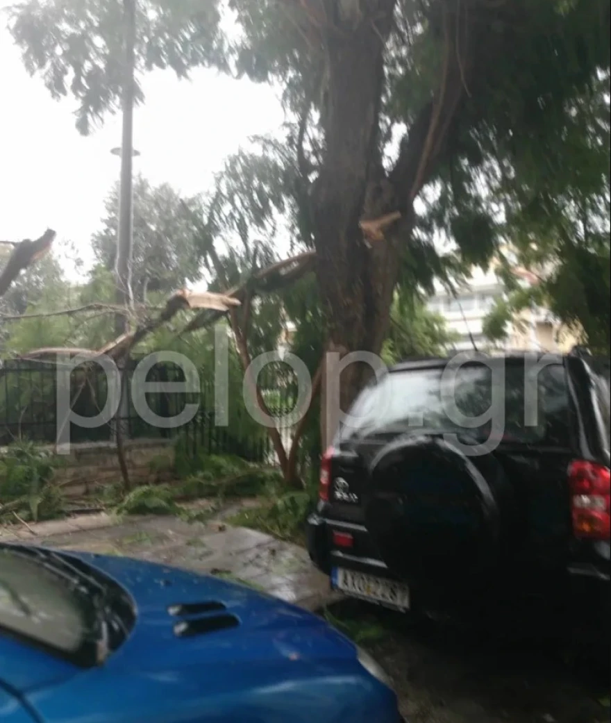 - Δέντρα έπεσαν πάνω σε αυτοκίνητα, προκαλώντας φθορές, ειδικά στην περιοχή πίσω από τον Ιερό Ναό του Αγίου Ανδρέα.