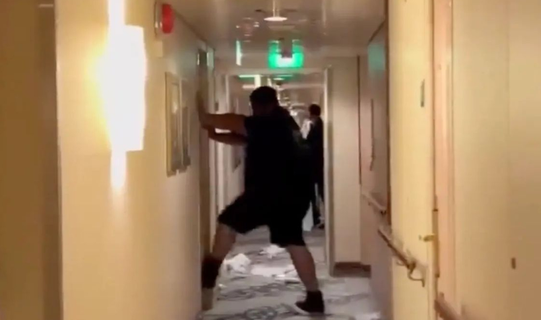 Σύμφωνα με την αγωγή, όταν άφησε το μπαρ σε κατάσταση βαριάς μέθης και δεν μπορούσε να εντοπίσει την καμπίνα του, εξαγριώθηκε και άρχισε να απειλεί πλήρωμα και επιβάτες ότι θα τους σκοτώσει.