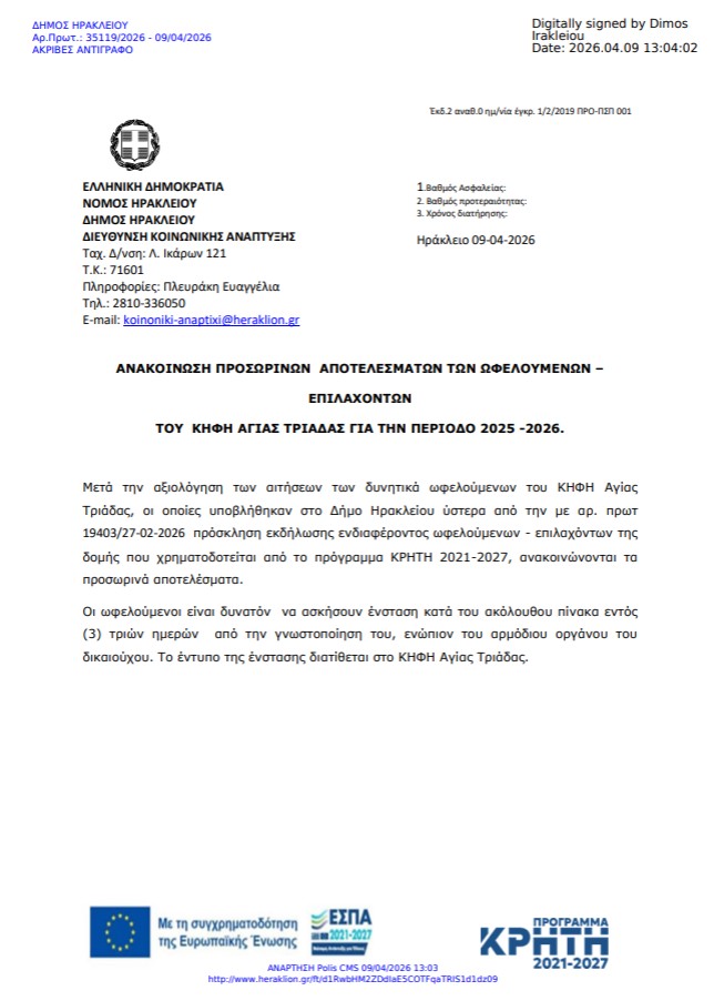 Το Κέντρο Ημερήσιας Φροντίδας Ηλικιωμένων (Κ.Η.Φ.Η.) Αγίας Τριάδας του Δήμου Ηρακλείου ανακοινώνει τα προσωρινά αποτελέσματα για την ένταξη πολιτών στο Κέντρο, έπειτα από την αξιολόγηση των αιτήσεων που κατατέθηκαν στον Δήμο, στο πλαίσιο της πρόσκλησης εκδήλωσης ενδιαφέροντος (αρ. πρωτ. 19403/27-02-2026) για ωφελούμενους και επιλαχόντες της δομής.