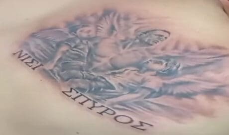 Στο τατουάζ αυτό, το οποίο αποτελεί ένα ανεξίτηλο σύμβολο της τραγωδίας στον ποταμό Άραχθο, απεικονίζεται ο ίδιος με φτερά αγγέλου, να προσπαθεί να ανασύρει τα δύο παιδιά – τα οποία επίσης έχουν φτερά – κρατώντας τα στην αγκαλιά του. Κάτω από το κάθε αγόρι, αναγράφονται τα ονόματά τους, Νίσι και Σπύρος.