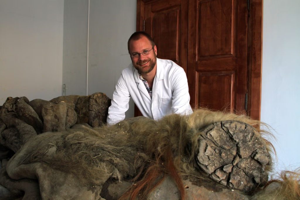 Ο ερευνητής Λόβε Ντάλεν με το μαλλιαρό μαμούθ. (Πηγή: Ian Watts/Stockholm University/PA)