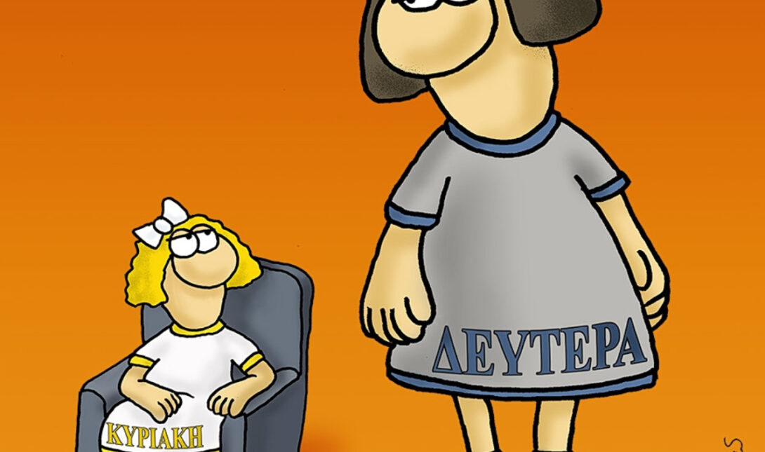 Στη σημερινή εικόνα βλέπουμε ένα έξυπνο παιχνίδι λέξεων: η «Μεγάλη» Δευτέρα παρουσιάζεται κυριολεκτικά μεγαλύτερη σε μέγεθος από την Κυριακή, που κάθεται μικρή και χαλαρή στην πολυθρόνα της.