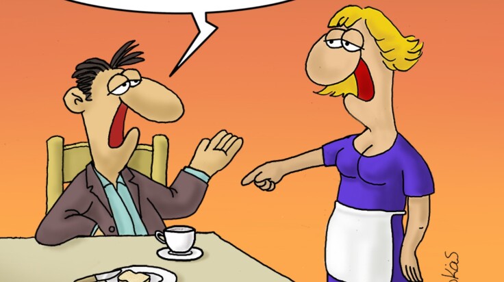 - Το σκίτσο απεικονίζει μια γυναίκα να ρωτά έναν άνδρα αν θέλει δεύτερο καφέ.