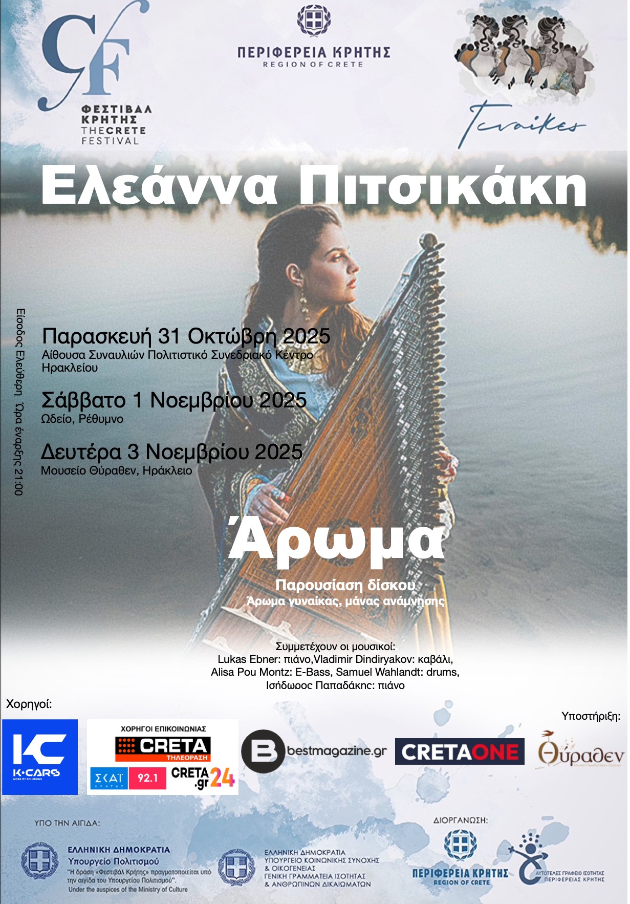 - Η Ελεάννα Πιτσικάκη επιστρέφει στην Κρήτη για τρεις συναυλίες παρουσιάζοντας το άλμπουμ «Άρωμα», το οποίο χαρακτηρίζεται ως «ένα μπουκαλάκι με μυρωδιές κι αναμνήσεις».
