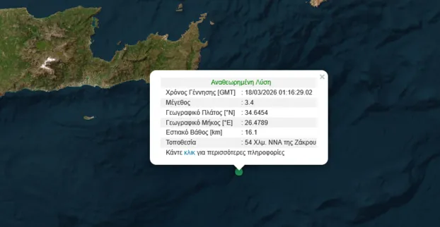 Ασθενής σεισμική δόνηση μεγέθους 3,4 βαθμών της κλίμακας Ρίχτερ σημειώθηκε τα ξημερώματα νότια της Κρήτης.
