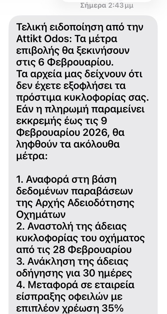 Τα αρχεία μας δείχνουν ότι δεν έχετε εξοφλήσει τα πρόστιμα κυκλοφορίας σας. Εάν η πληρωμή παραμείνει εκκρεμής έως τις 9 Φεβρουαρίου 2026, θα ληφθούν τα ακόλουθα μέτρα: