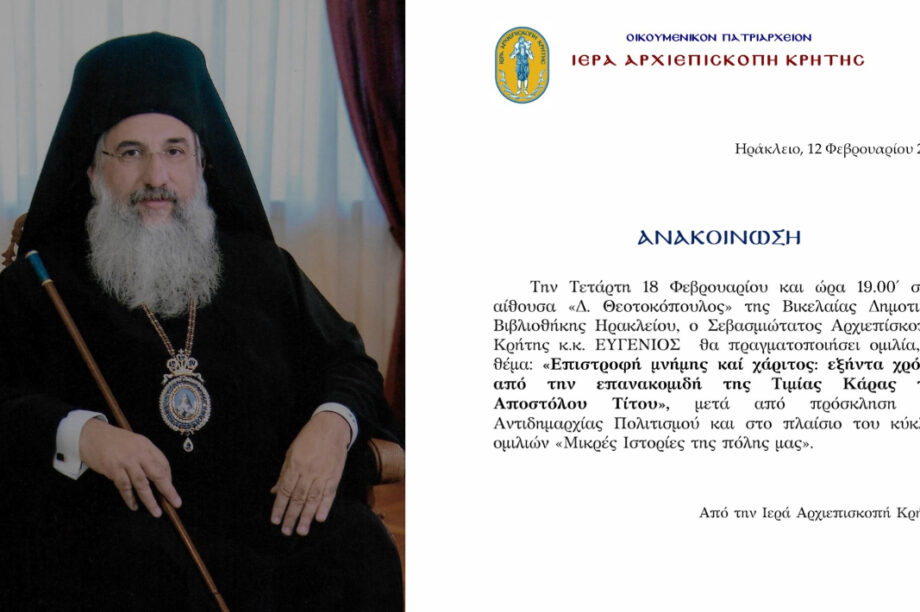 13.02.2026, 11:50 Ηράκλειο: Με ομιλητή τον Αρχιεπίσκοπο Κρήτης Ευγένιο η επόμενη ομιλία στις «Μικρές Ιστορίες της Πόλης»