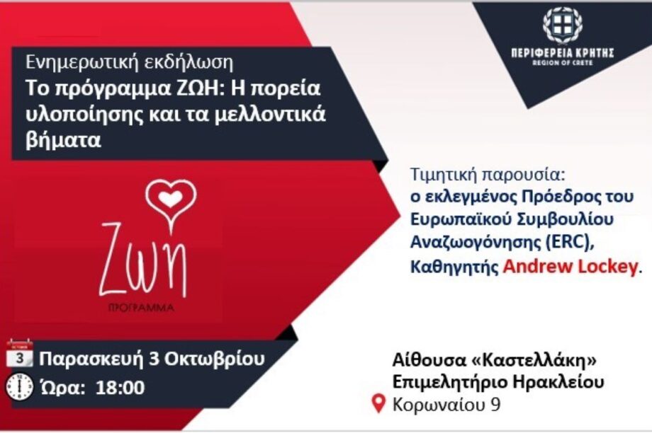 02.10.2025, 14:56 Με τη στήριξη της Περιφέρειας Κρήτης θα πραγματοποιηθεί η εκδήλωση «Το πρόγραμμα ΖΩΗ: Η πορεία υλοποίησης και τα μελλοντικά βήματα»