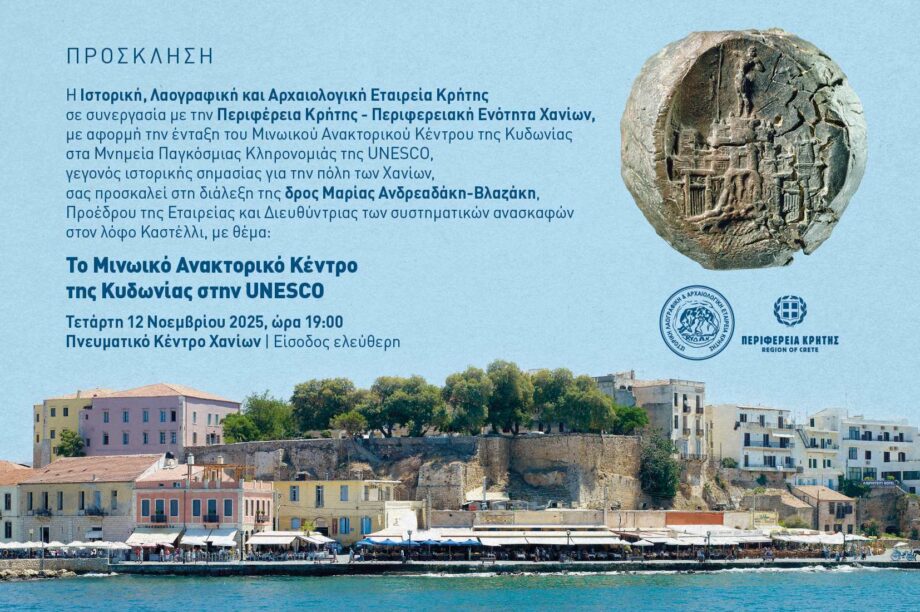 05.11.2025, 16:58 Χανιά: Την Τετάρτη 12/11 η διάλεξη με τίτλο «Το Μινωικό Ανακτορικό Κέντρο της Κυδωνίας στην UNESCO»