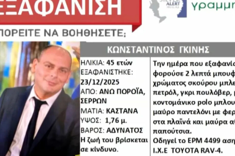 27.12.2025, 10:52 Θρίλερ με την εξαφάνιση του Κωσταντίνου Γκίνη – Συνεχίζονται οι έρευνες για τον εντοπισμό του διοικητή της πυροσβεστικής