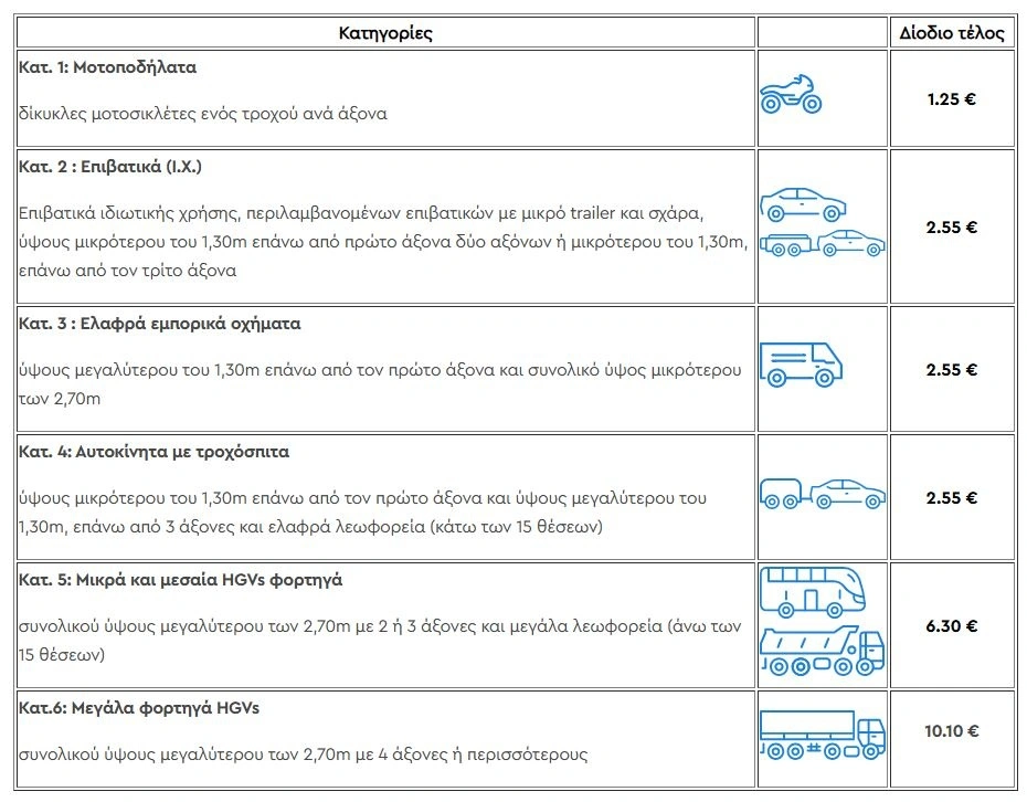 Πρόκειται για ήπιες αναπροσαρμογές, ωστόσο επηρεάζουν τη συχνότητα διέλευσης, ειδικά για τα Ι.Χ. και τα φορτηγά, με τις αυξήσεις να κυμαίνονται από 0,05 έως 0,10 ευρώ ανά διέλευση, σε σχέση με τις τρέχουσες τιμές.
