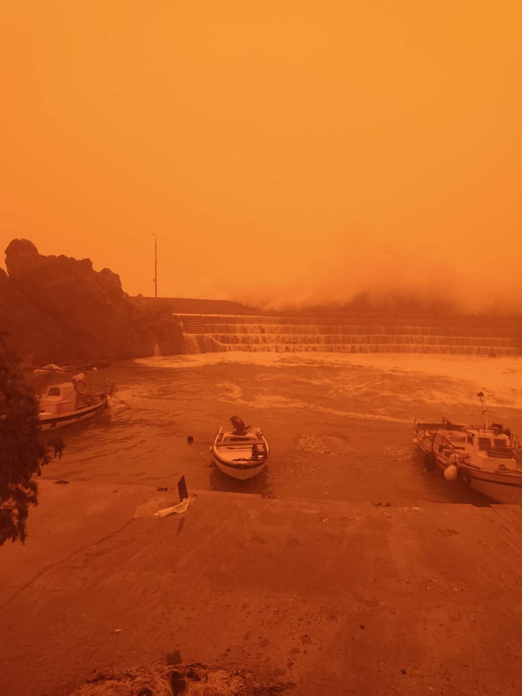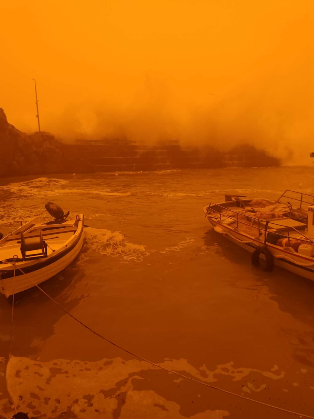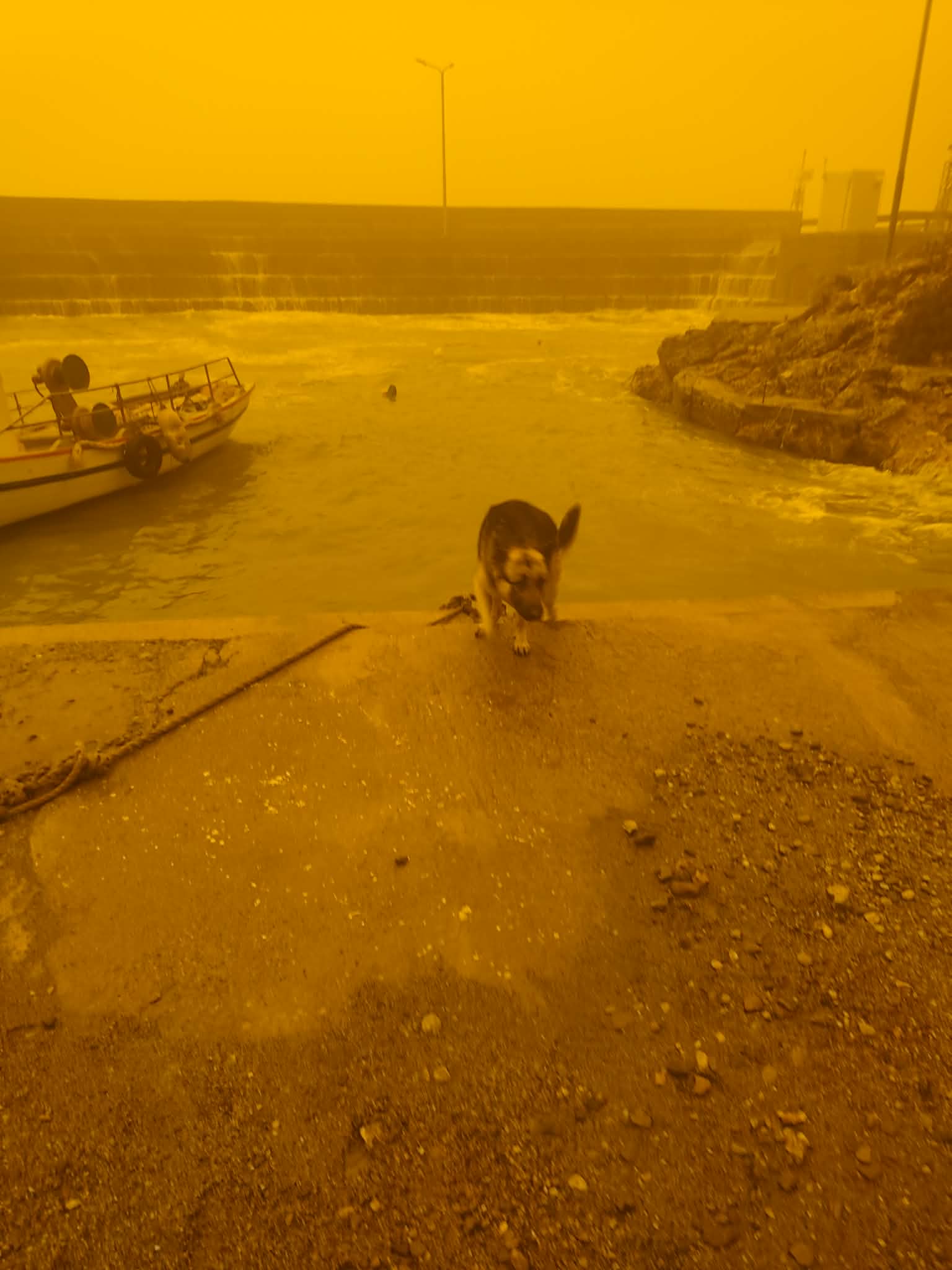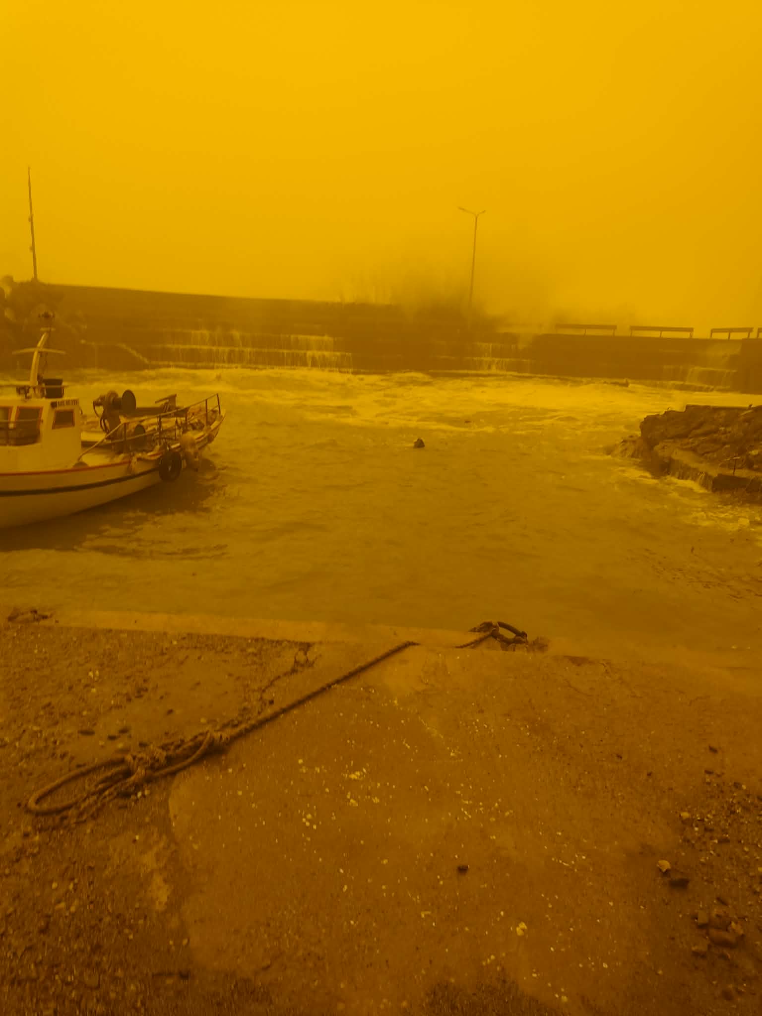 Απόκοσμες εικόνες και στη Σούγια, με την σκόνη κι εκεί να σκεπάζει τα πάντα, ενώ οι θυελλώδεις άνεμοι έχουν ως αποτέλεσμα να δημιουργούνται κύματα ύψους πολλών μέτρων, τα οποία «καταπίνουν» το λιμάνι της περιοχής!