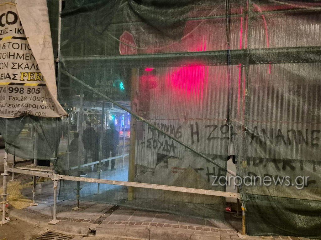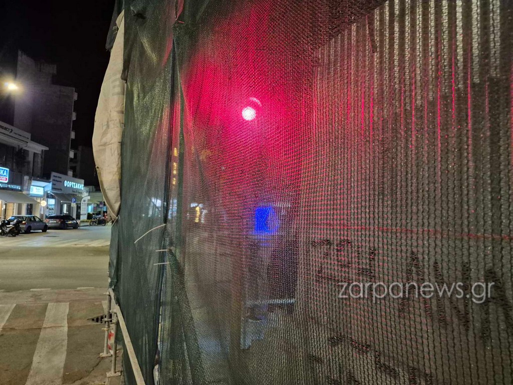 Ένα φανάρι… «εγκλωβίστηκε» μες στις σκαλωσιές στο κέντρο της πόλης των Χανίων, σε σημείο που γίνονται εργασίες.