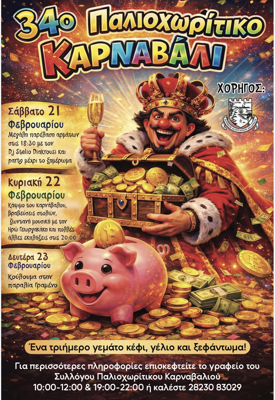 Το Παλιοχωρίτικο Καρναβάλι καλεί κατοίκους και επισκέπτες να πάρουν μέρος στις εκδηλώσεις και να ζήσουν τρεις ημέρες γεμάτες χαρά, παράδοση και ξενοιασιά.