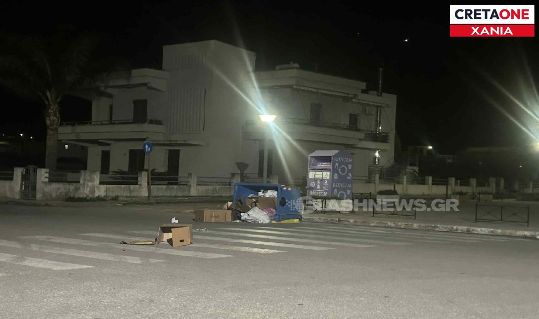 - Στη Σούδα, ένας κάδος ανακύκλωσης παρασύρθηκε και έπεσε στο οδόστρωμα.