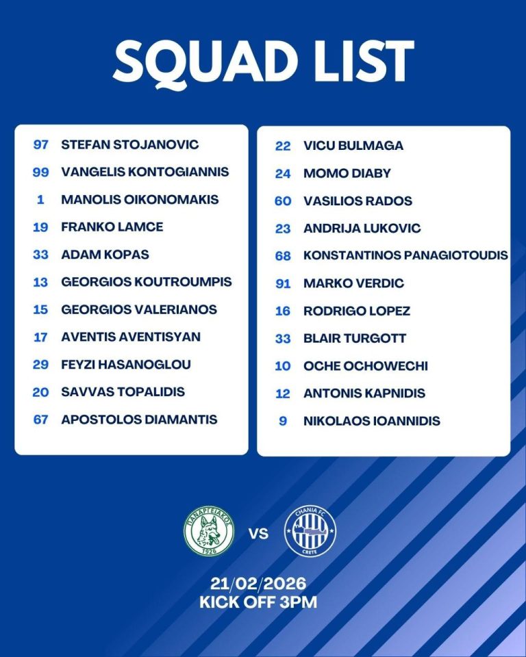 Την αποστολή των Χανίων για τον αγώνα με τον Παναργειακό απαρτίζουν οι: Στογιάνοβιτς, Κοντογιάννης, Οικονομάκης, Λάμτσε, Κοπάς, Κουτρουμπής, Βαλεριάνος, Αβεντισιάν, Χασάνογλου, Τοπαλίδης, Διαμαντής, Μπουλμάγκα, Ντιαμπί, Ράδος, Λούκοβιτς, Παναγιωτούδης, Βάρντιτς, Λόπεζ, Τούργκοτ, Οτσοβέτσι, Καπνίδης και Ιωαννίδης