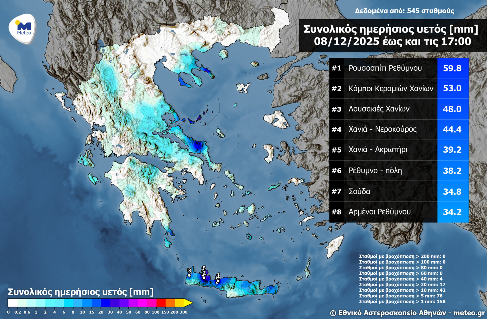 Κάμποι Κεραμειών, Λουσακιές Κισσάμου, Νεροκούρου, Ακρωτήρι, Σούδα, Αρμένοι είναι οι περιοχές των Χανίων που καταγράφηκαν τα μεγαλύτερα ύψη βροχής.
