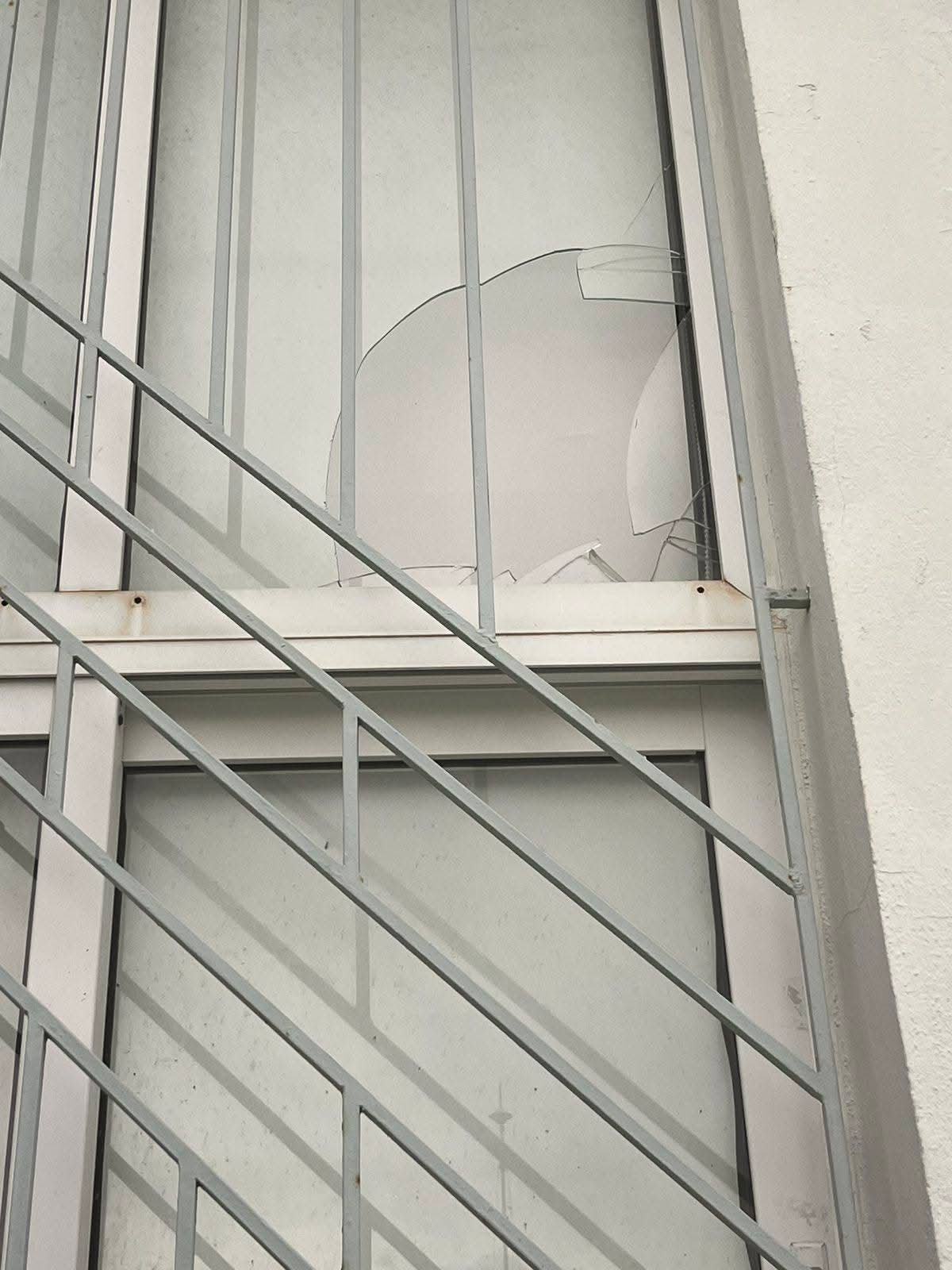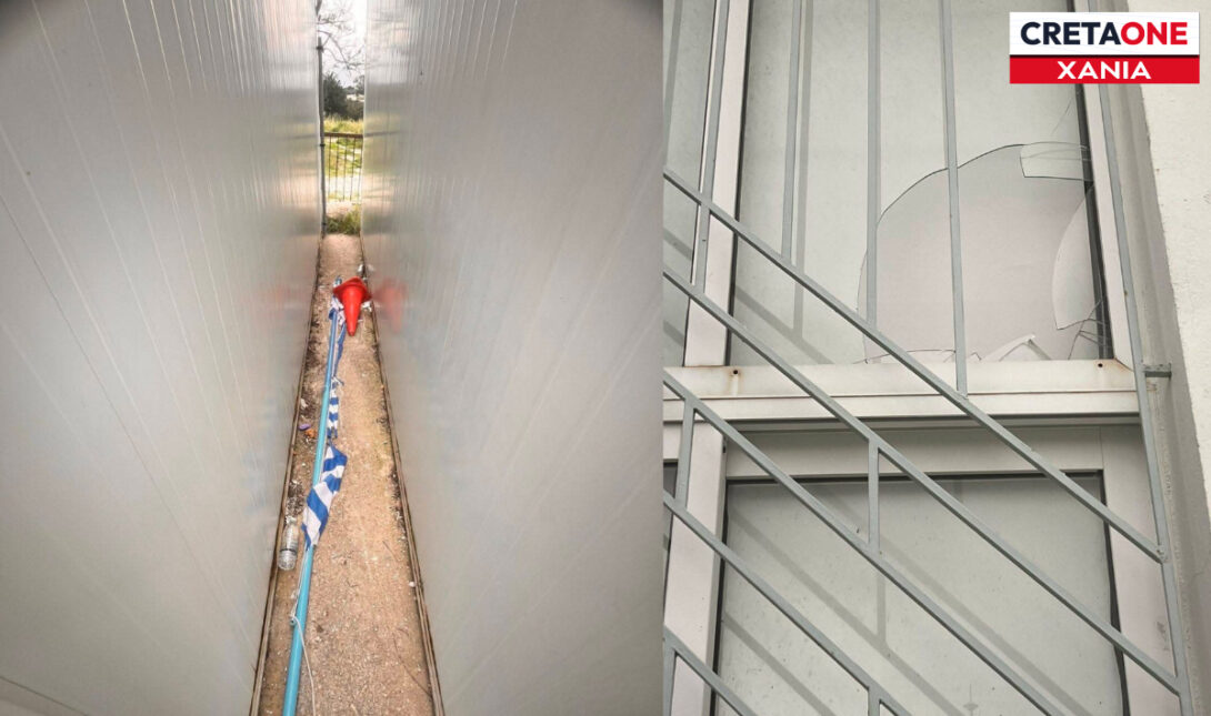 - Οι εικόνες δείχνουν σπασμένες υδρορροές, κατεστραμμένες τζαμαρίες και πεταμένη σημαία.