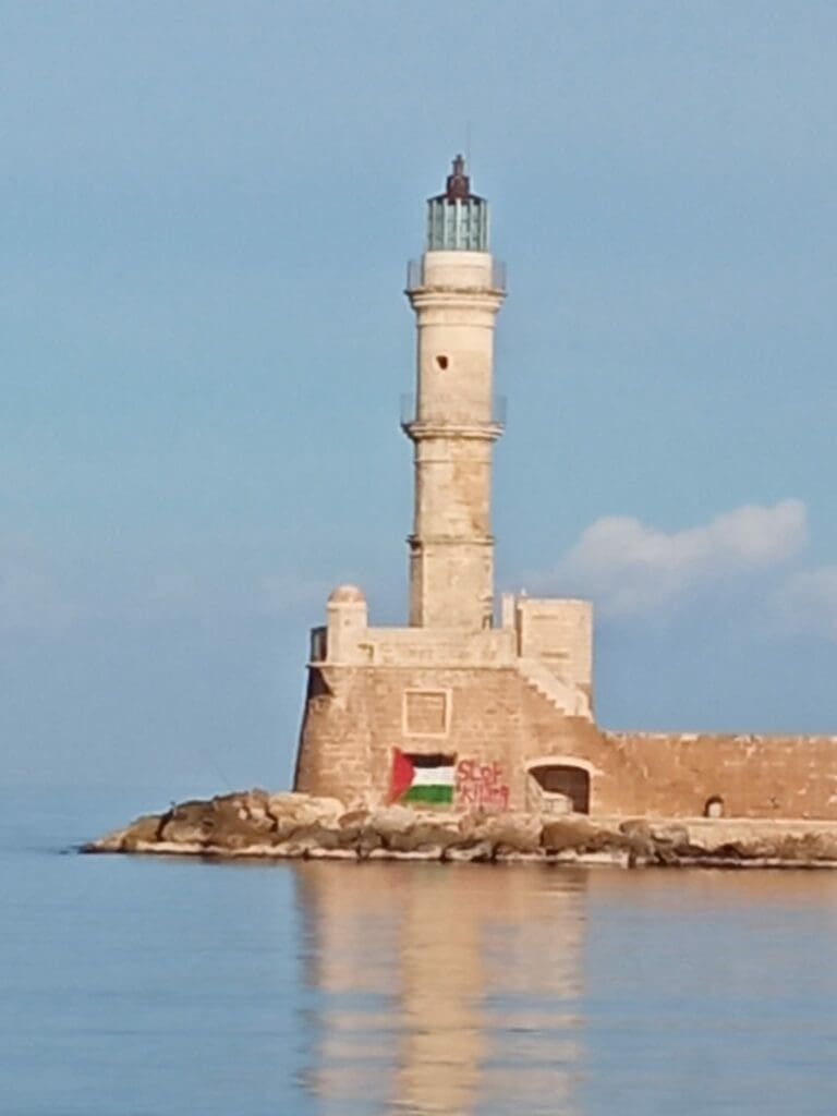 Άγνωστοι, μέχρι στιγμής, ζωγράφισαν την Παλαιστινιακή σημαία στην βάση του μνημείου του φάρου στο ενετικό λιμάνι των Χανίων, κατά την διάρκεια της νύχτας. Η ζωγραφιά «συνοδεύτηκε» από την φράση «Stop killing».