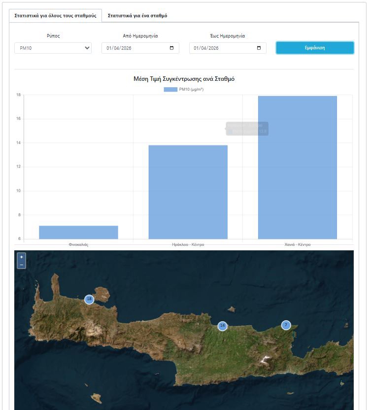 Οι συγκεντρώσεις αιωρούμενων σωματιδίων είναι εξαιρετικά υψηλές στην Κρήτη την Τετάρτη 01/04/2026. Οι σταθμοί ποιότητας αέρα που λειτουργεί από το Meteo.gr / Εθνικό Αστεροσκοπείο Αθηνών στο Δημαρχείο Ρεθύμνου και στο Αδελε (ως μέρος του Ολοκληρωμένου Συστήματος Παρακολούθησης Καιρικών Συνθηκών Ρεθύμνου) κατέγραψαν το μεσημέρι της Τετάρτης 01/04 συγκεντρώσεις που προσέγγισαν τα 1000 μικρογραμμάρια/κυβικό μέτρο (βλ. χάρτη παρακάτω).