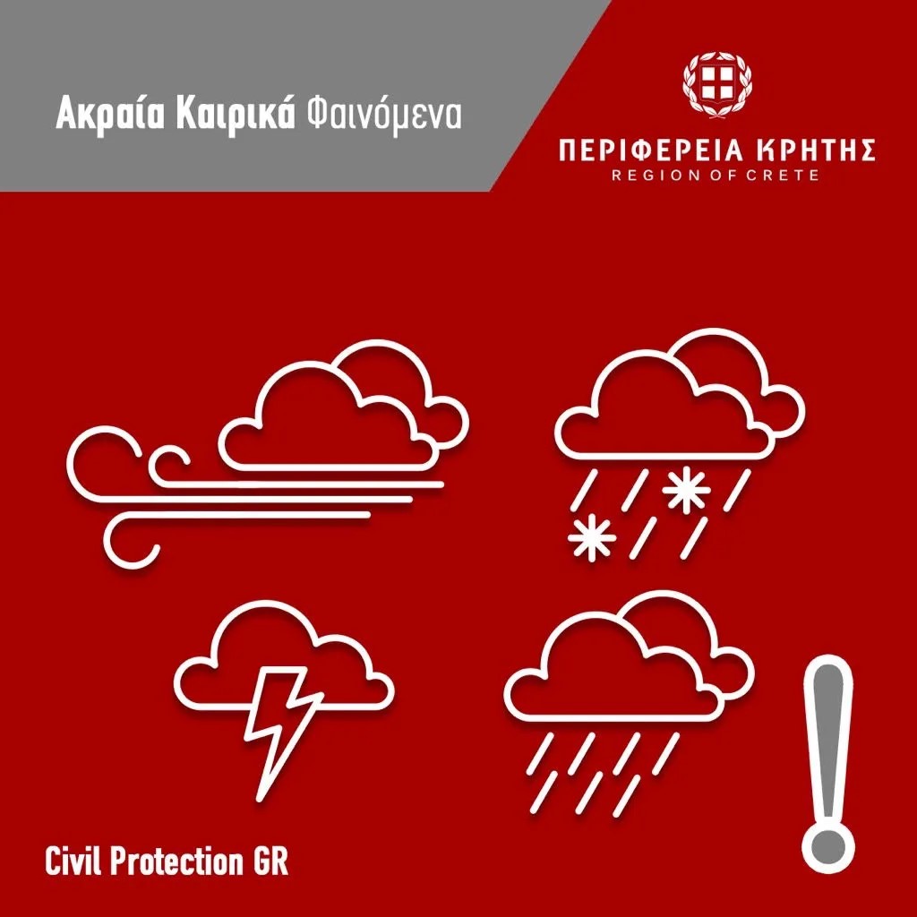 - Η Περιφέρεια Κρήτης εξέδωσε οδηγίες αυτοπροστασίας λόγω επιδείνωσης του καιρού, με έμφαση στις χιονοπτώσεις και τις καταιγίδες.