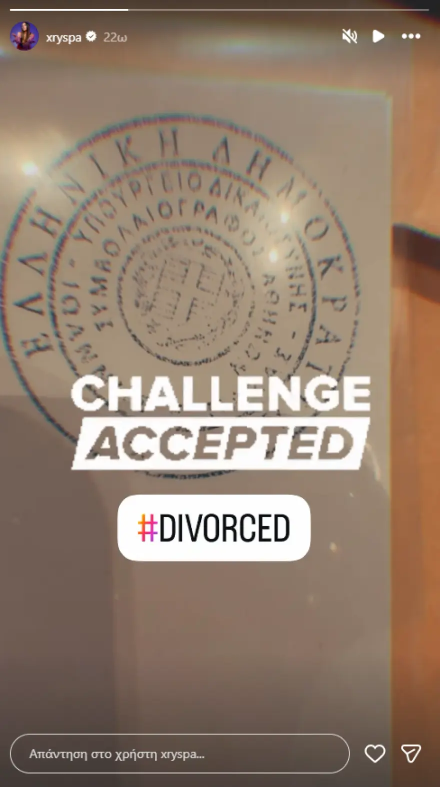 Η τραγουδίστρια δημοσίευσε στον προσωπικό της λογαριασμό στο Instagram ένα story, στο οποίο φαίνεται η σφραγίδα ενός συμβολαιογράφου. Πάνω στη φωτογραφία, έγραψε: «Αποδέχομαι την πρόκληση. Χωρισμένη».