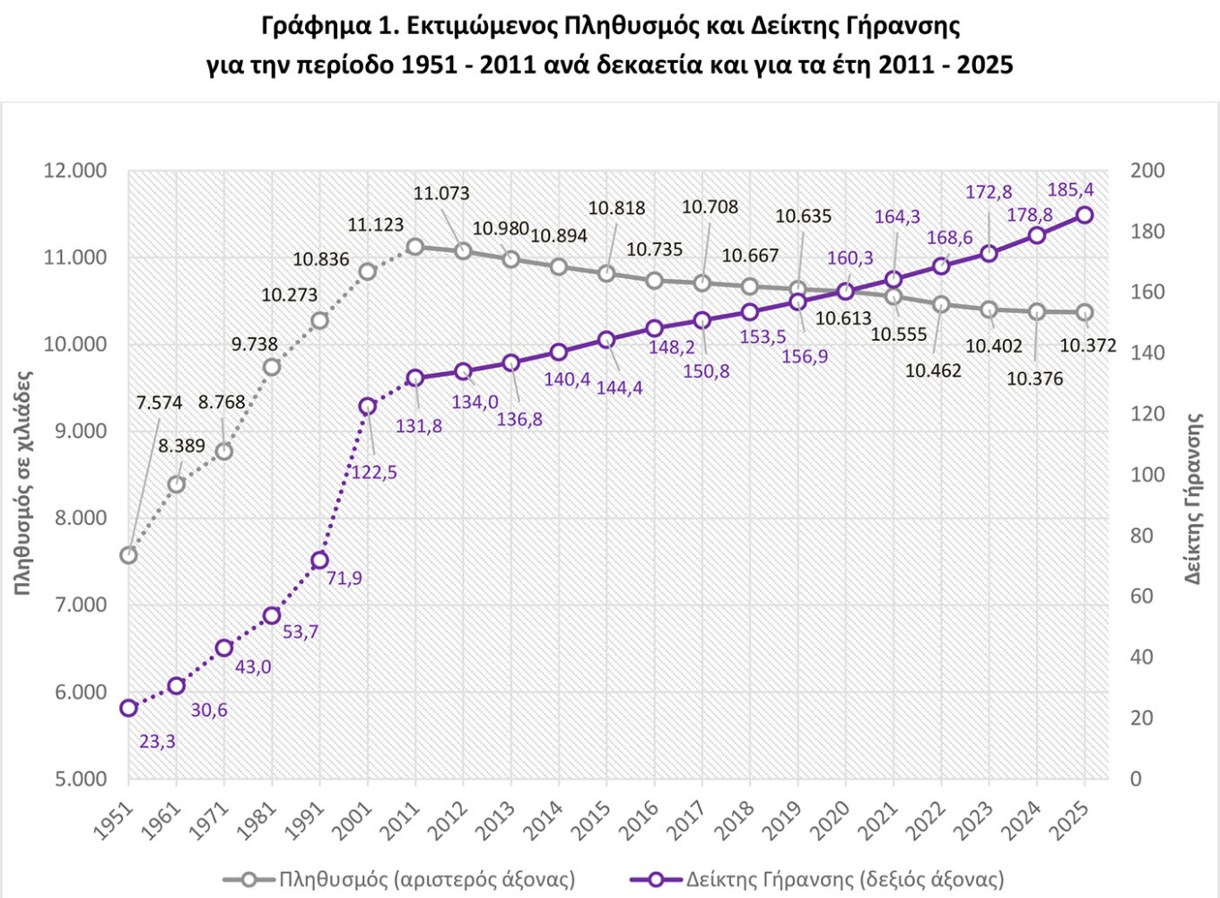 Παράλληλα, εξίσου ανησυχητικά είναι και τα δημογραφικά χαρακτηριστικά: Την 1η Ιανουαρίου του 2025 ο πληθυσμός ηλικίας 65 ετών και άνω αντιστοιχούσε στο 23,7%, ενώ τα παιδιά 0–14 ετών μόλις στο 12,8%.