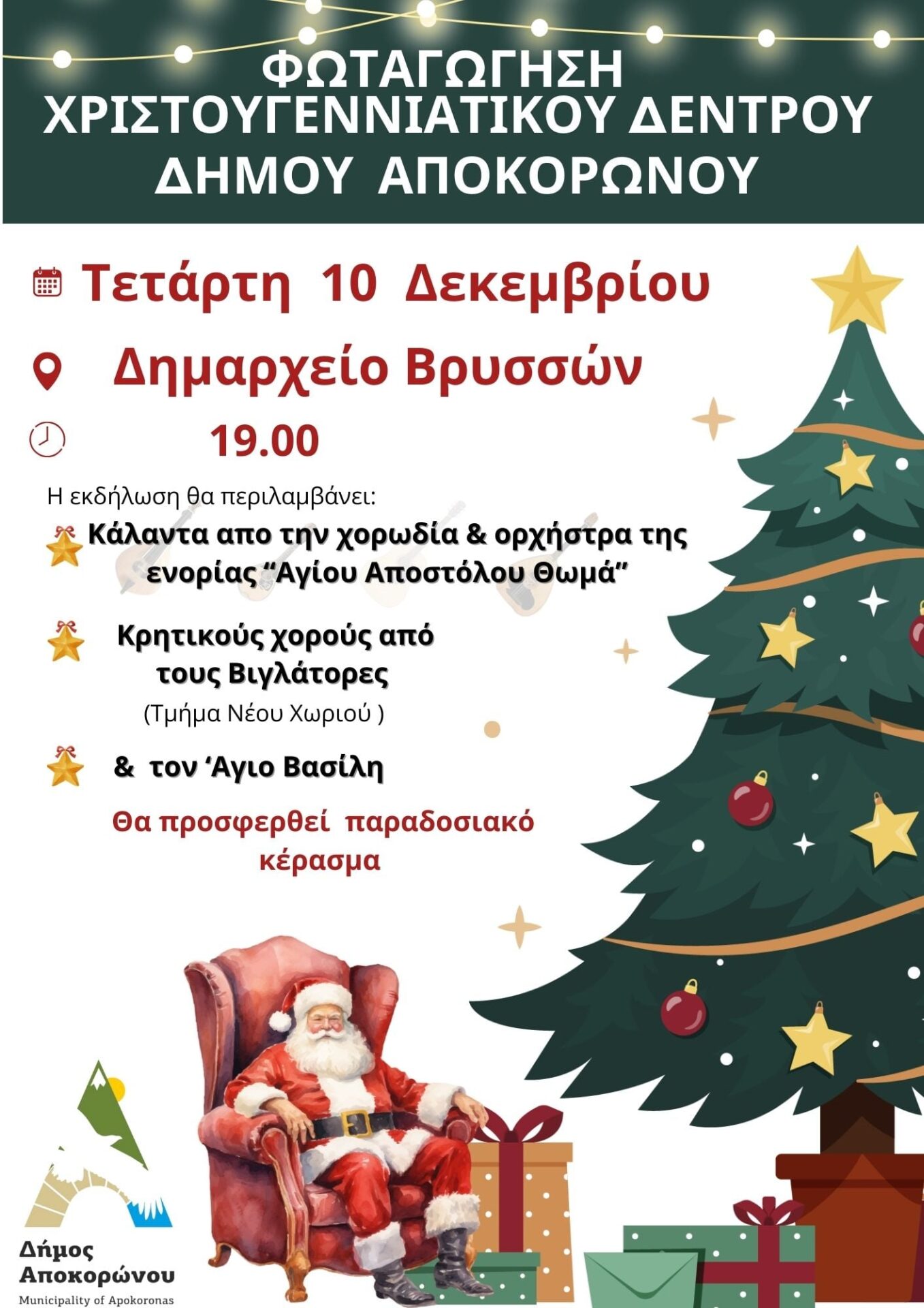 Σε ανακοίνωση του ο Δήμος αναφέρει: «Σας περιμένουμε όλες και όλους την Τετάρτη 10 Δεκεμβρίου, στις 19:00, στο Δημαρχείο Βρυσών στην εορταστική εκδήλωση για τη φωταγώγηση του Χριστουγεννιάτικου Δέντρου του Δήμου. Ελάτε να φωτίσουμε τον ουρανό του Αποκόρωνα με φως, χαμόγελα και ελπίδα για ένα καλύτερο αύριο.