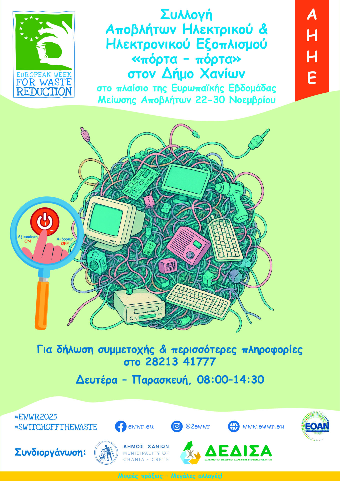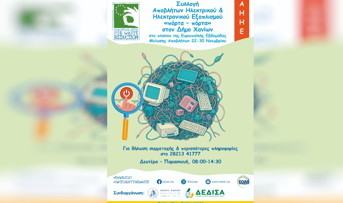 Στο πλαίσιο της Ευρωπαϊκής Εβδομάδας Μείωσης Αποβλήτων (22-30 Νοεμβρίου 2025), ο Δήμος Χανίων σε συνεργασία με τη Διαδημοτική Επιχείρηση Διαχείρισης Στερεών Αποβλήτων [Δ.Ε.ΔΙ.Σ.Α. ΑΕ (ΟΤΑ)] πραγματοποιεί για ακόμα μία φορά συλλογή ηλεκτρικών και ηλεκτρονικών αποβλήτων με το σύστημα «πόρτα-πόρτα».