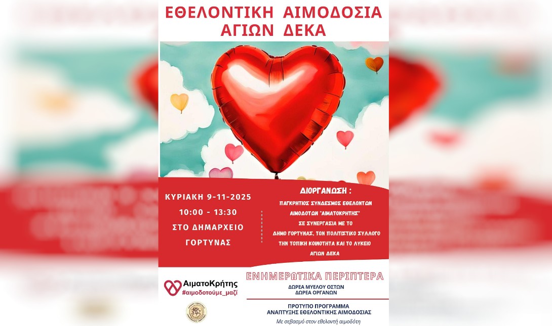 Ο Παγκρήτιος Σύνδεσμος Εθελοντών Αιμοδοτών και Δωρητών Οργάνων Σώματος «Αιματοκρήτης» διοργανώνει, σε συνεργασία με τον Δήμο Γόρτυνας, την Δημοτική Κοινότητα, τον Πολιτιστικό Σύλλογο και το Γενικό Λύκειο Αγίων Δέκα, εθελοντική αιμοδοσία, την Κυριακή 9 Νοεμβρίου 2025, ώρα 10:00 – 13:30, στο Δημαρχείο Γόρτυνας.
